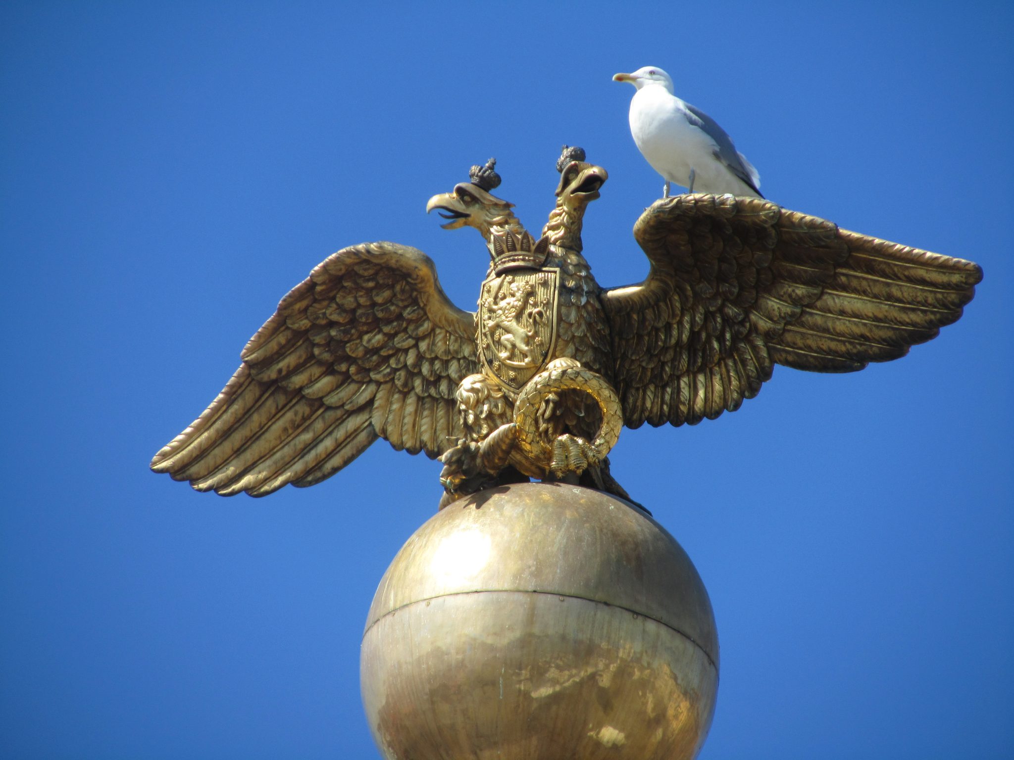 golden russian two-headed eagle sitting on an orb in Helsinki