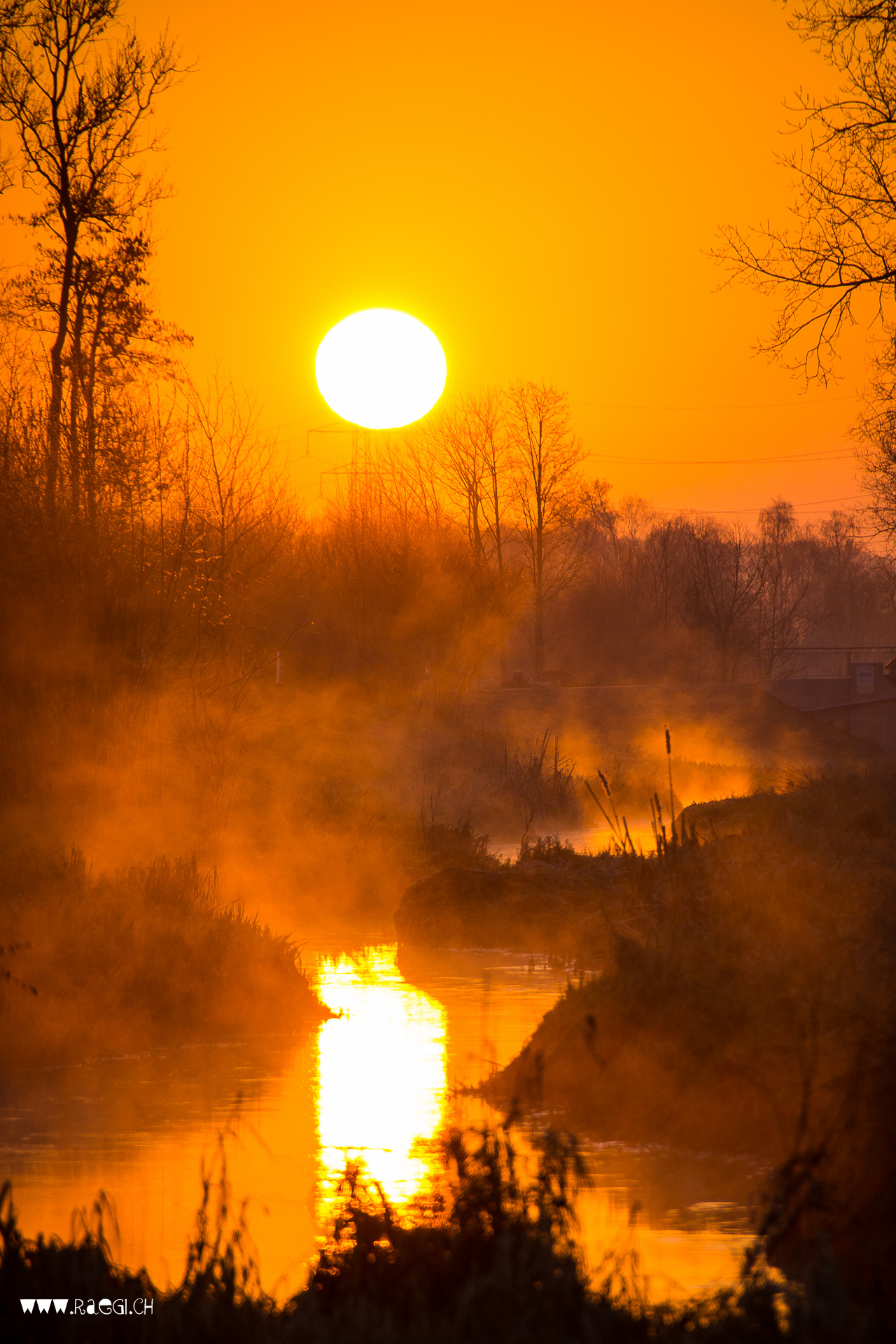 Ein kleineres Naturschauspiel bot sich mir diese Woche aber auch am Furtbach. Auf meinem Arbeitsweg mit dem Fahrrad sah ich, wie sich die Sonne beim Sonnenaufgang gerade im Bach spiegelt. Dieser Winkel ändert sich offenbar auch sehr schnell, denn schon am Mittwoch, war die Sonne etwas verschoben. Also für mich heisst das jetzt, alle halbe Jahre, zwei Tage vor dem Sonnenwunder von Elm steht die Sonne gerade über dem Furtbach! 🙂 Kann das Zufall sein?