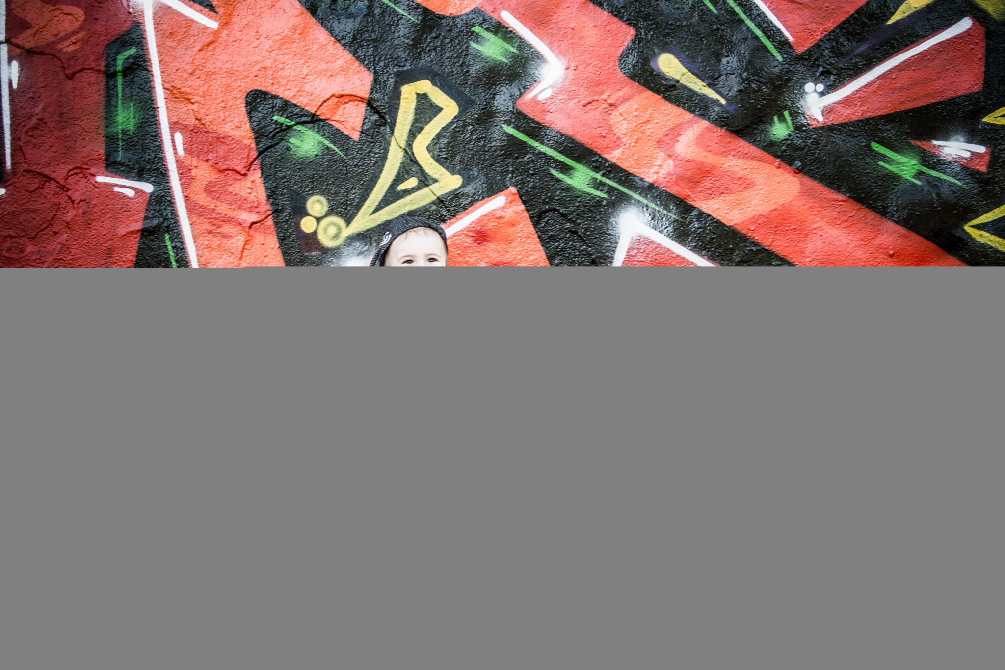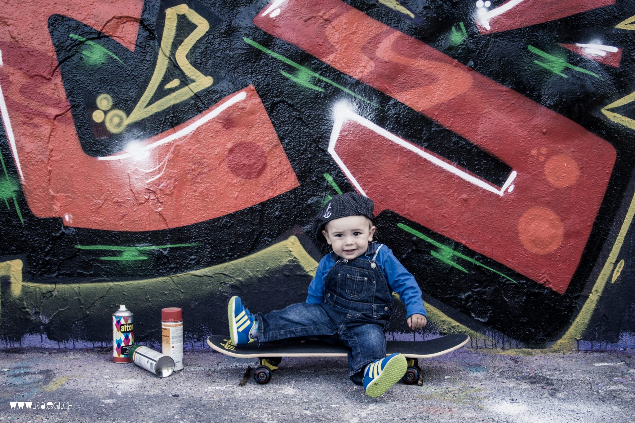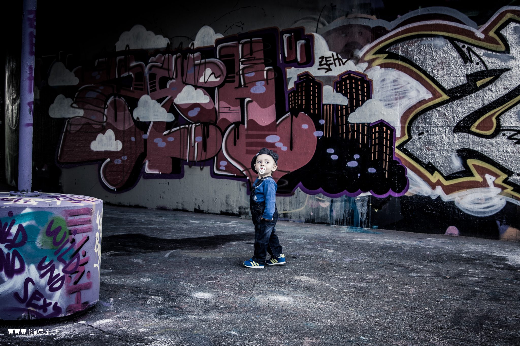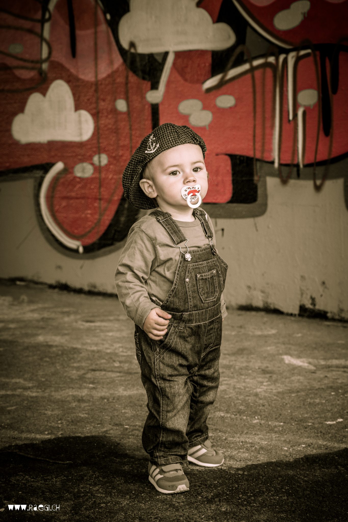 Einfach goldig, der kleine Mann mit seinen Latzhosen! Kühn steht er da, selbstbewusst, er ist ganz sicher, dass er das Grafitti auch hinbekommen hätte. Super!