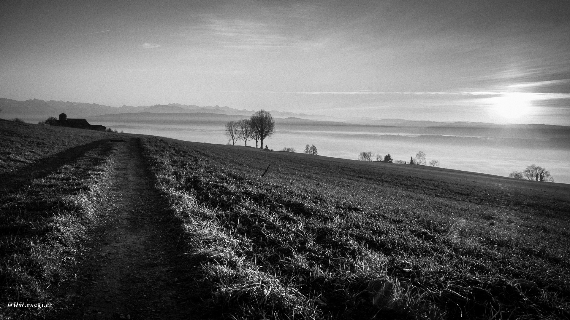 Im Dezember wird es früh Abend. Wunderschöne Sonnenuntergangstimmung auf dem Heitersberg mit Blick auf das Nebelmeer im Reusstal.