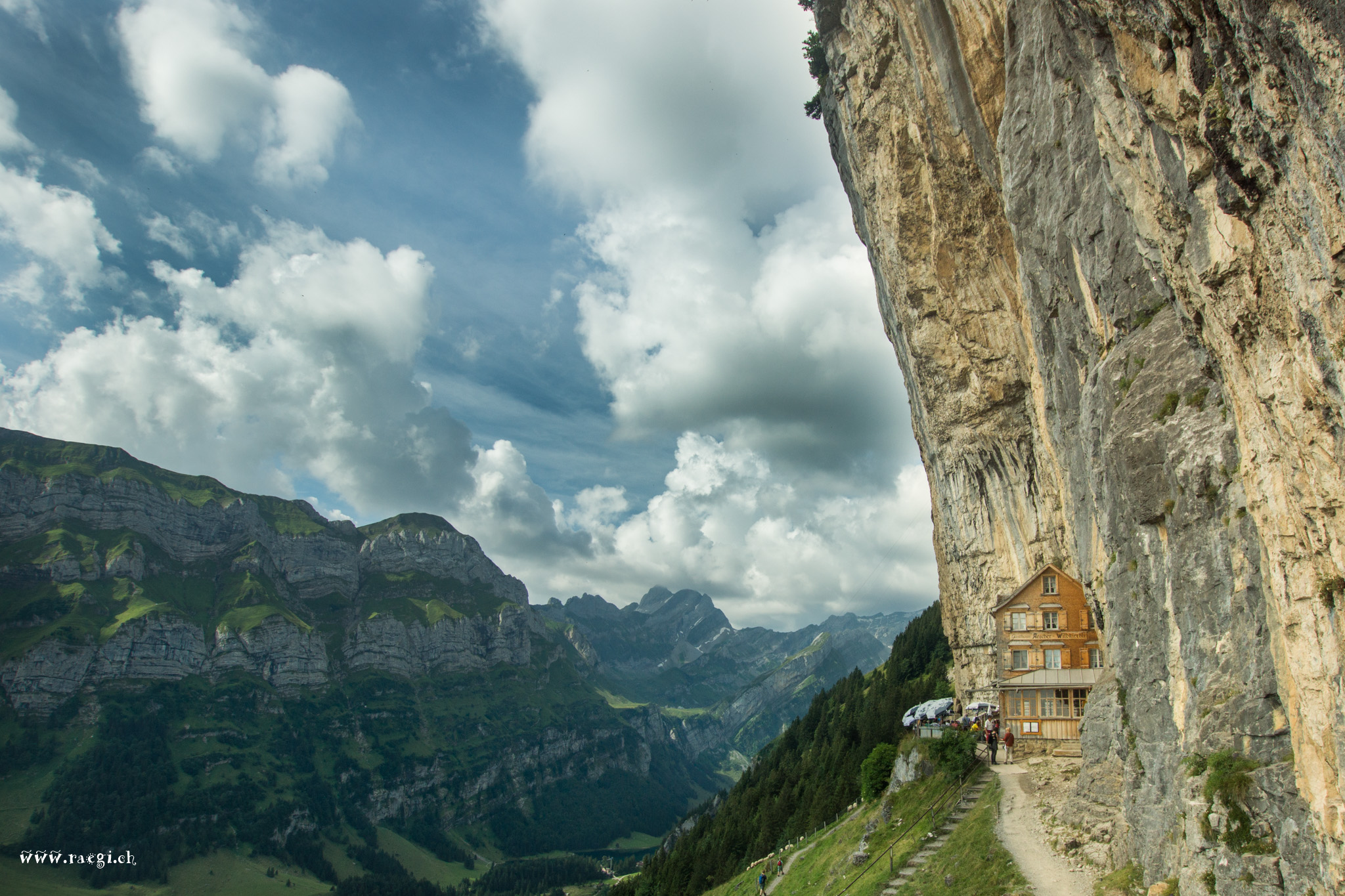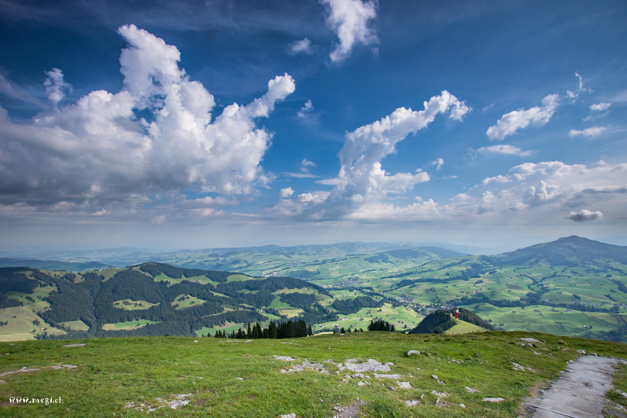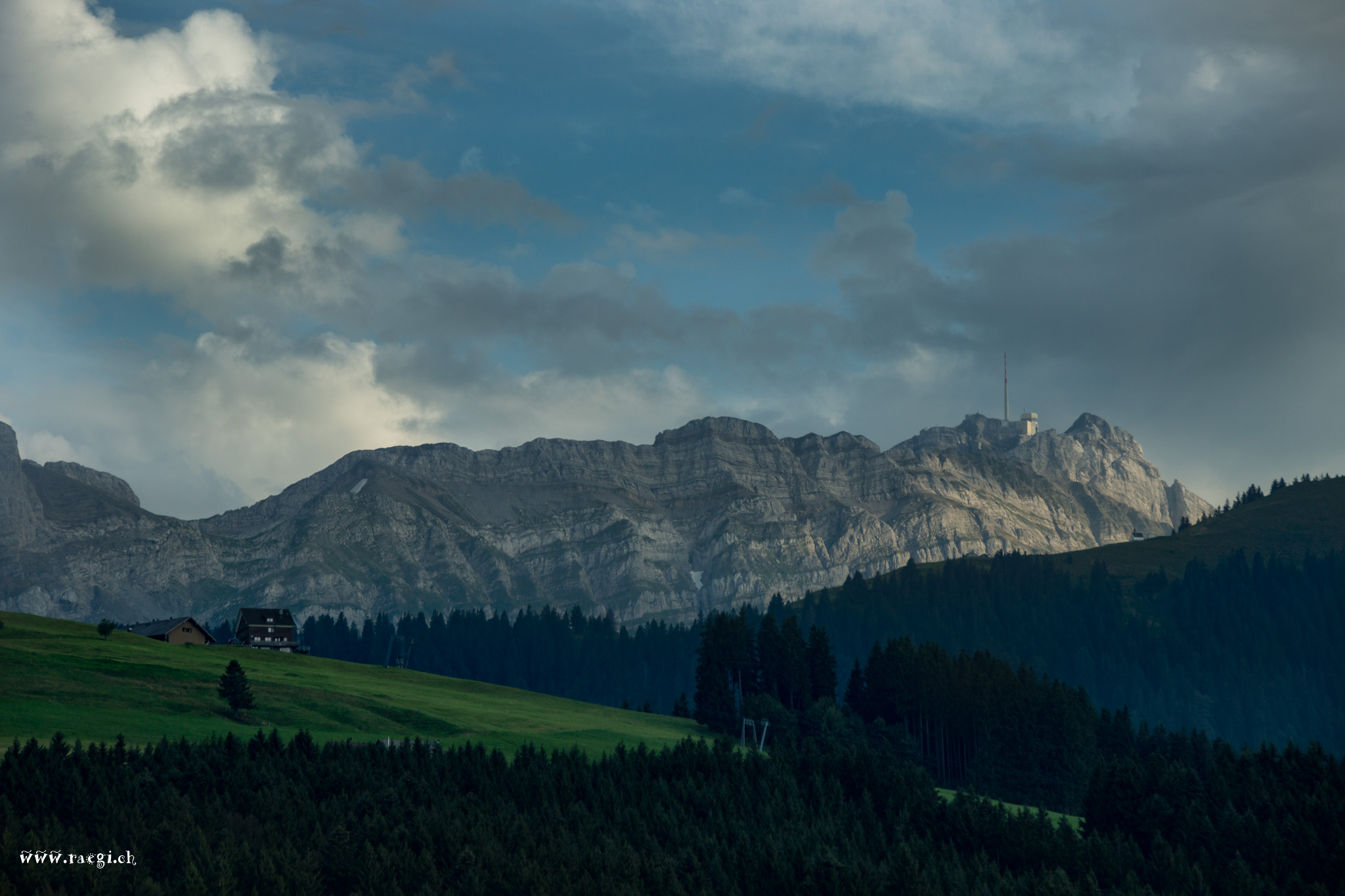 Über der sehr gepflegten Hügellandschaft steht das Alpstein-Massiv mit dem von fast überall her sichtbaren Säntis.