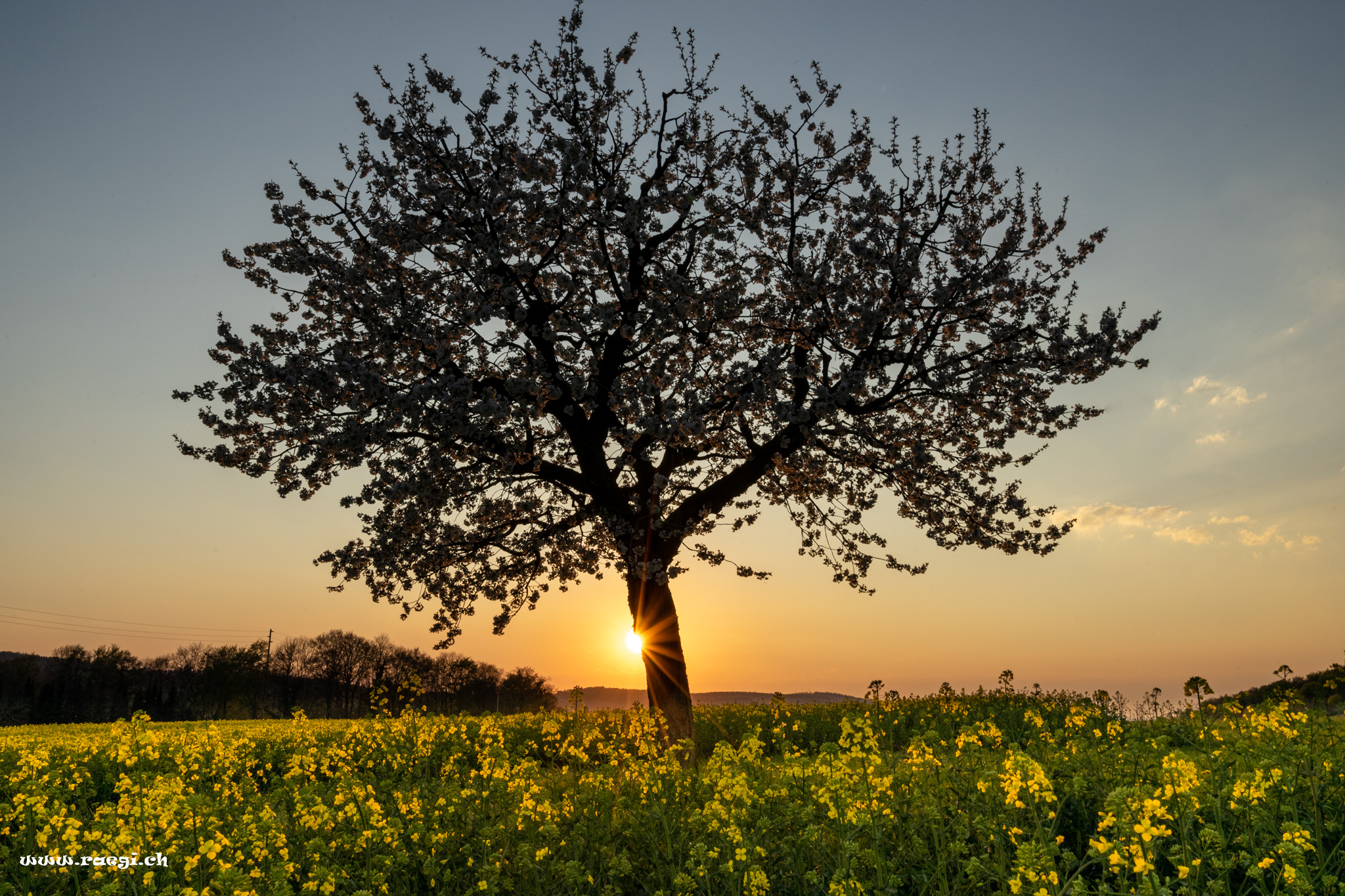Rapsfeld mit Kirschbaum im warmen Abendlicht
