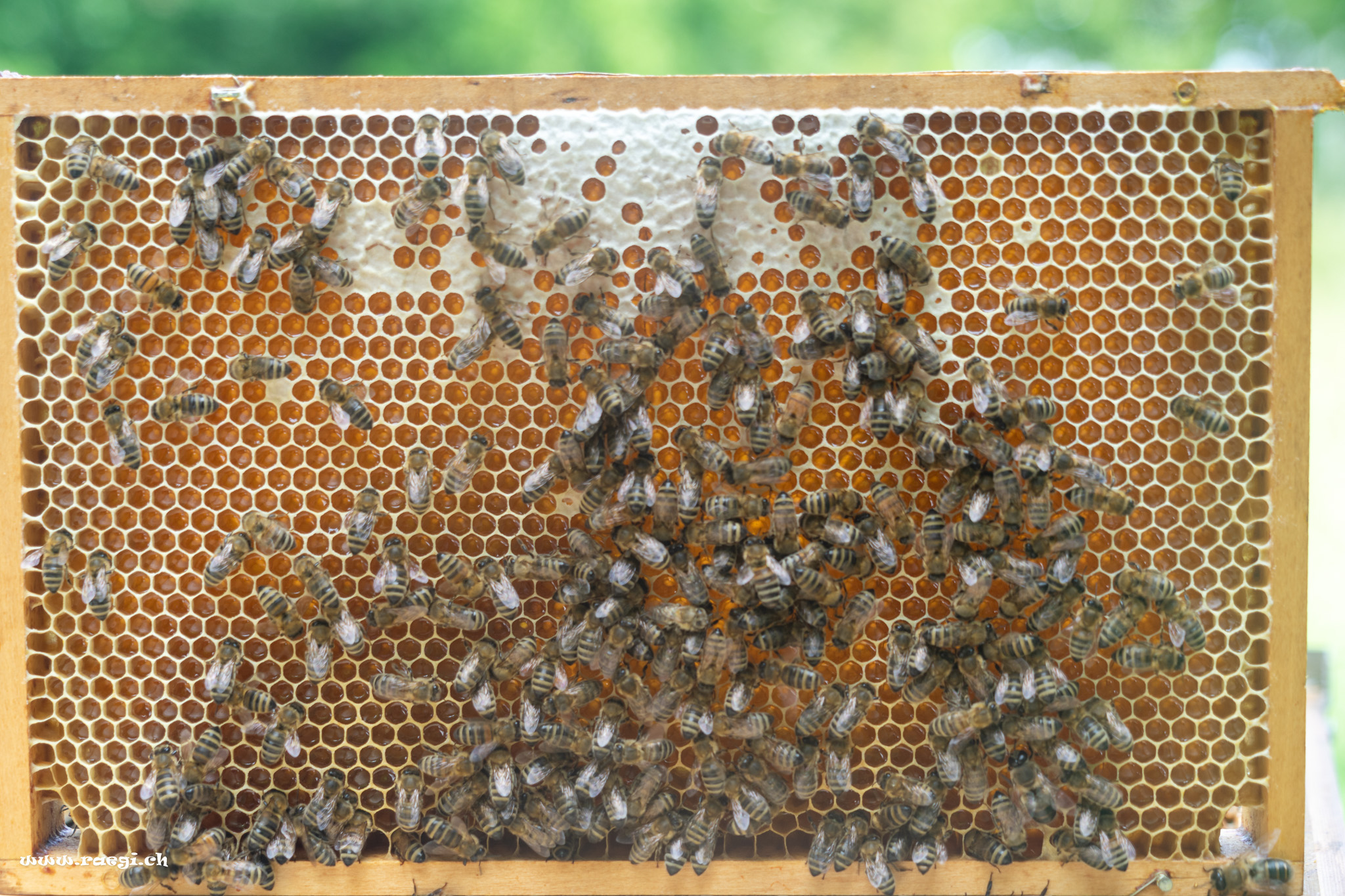 Volle Waben wiegen gerne über 1 Kg, was beim rausnehmen eine starke und ruhige Hand erfordert. Der Tämpi sagt mir, „die Bienen lieben es nicht unbedingt, wenn ihnen jemand an den Honig will“. Somit gehört der einte oder andere Stich in die Hand halt zur Routine beim Imkern. „Entweder man wird schon fast immun gegen das Gift, oder man reagiert allergisch“ erklärt er. Das sieht man dann schon nach ein paar Stichen. Wichtig ist es, die Ruhe zu bewahren und die Wabe nicht etwa noch fallen zulassen. Dann hätte man wohl Party im Bienenstall. Die Bienen reagieren bei Gefahr durch lautes Summen. Dies wird von den Kollegen als Warnsignal registriert und kann sich auf die anderen Bienen ausbreiten. Wenn dann mal ein ganzes Volk auf Attacke umschaltet kann es auch mit Schutzanzug relativ ungemütlich werden. Somit lautet die aller oberste Devise beim Imkern – Keep Cool! (Auch wenn ein liebes Bienchen auf die Nase zielt!)