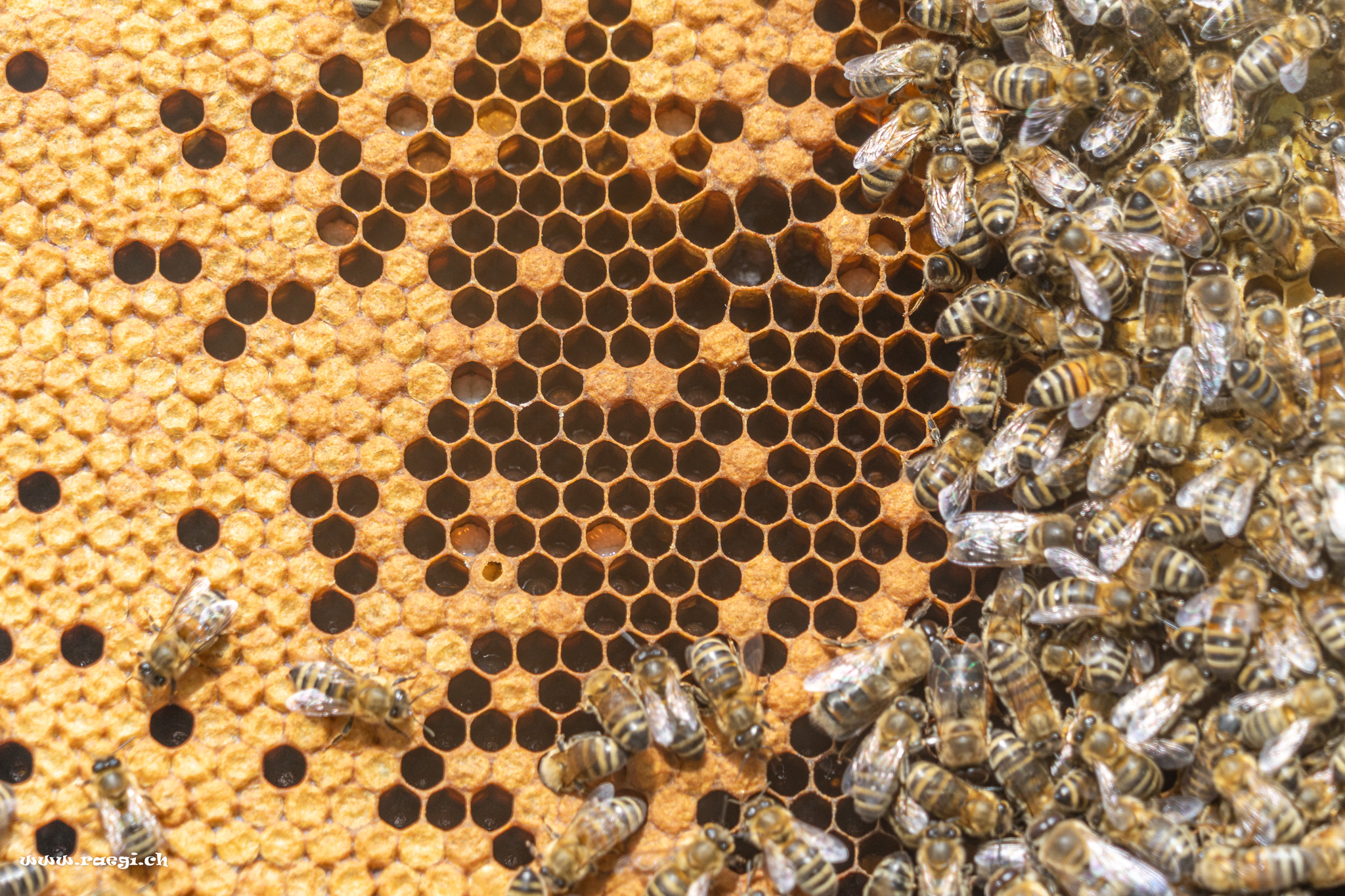 Der Aufbau der Honig- Pollen und Brutwaben orintiert sich am Einflugloch. Die Bienen bauen hierzu die bekannten 6-eckigen Waben, welche den vorhandenen Platz optimal ausschöpfen. Den Wachs für den Bienenbau produzieren die Bienen mit Schwitzen. Winzige Wachsplättchen werden aus den Wachsdrüsen ausgeschieden, durchgekauft und auf den Waben aufgebaut. Ist die Wabe voll, verschliessen die Bienen die Waben mit einem weissen Deckel.