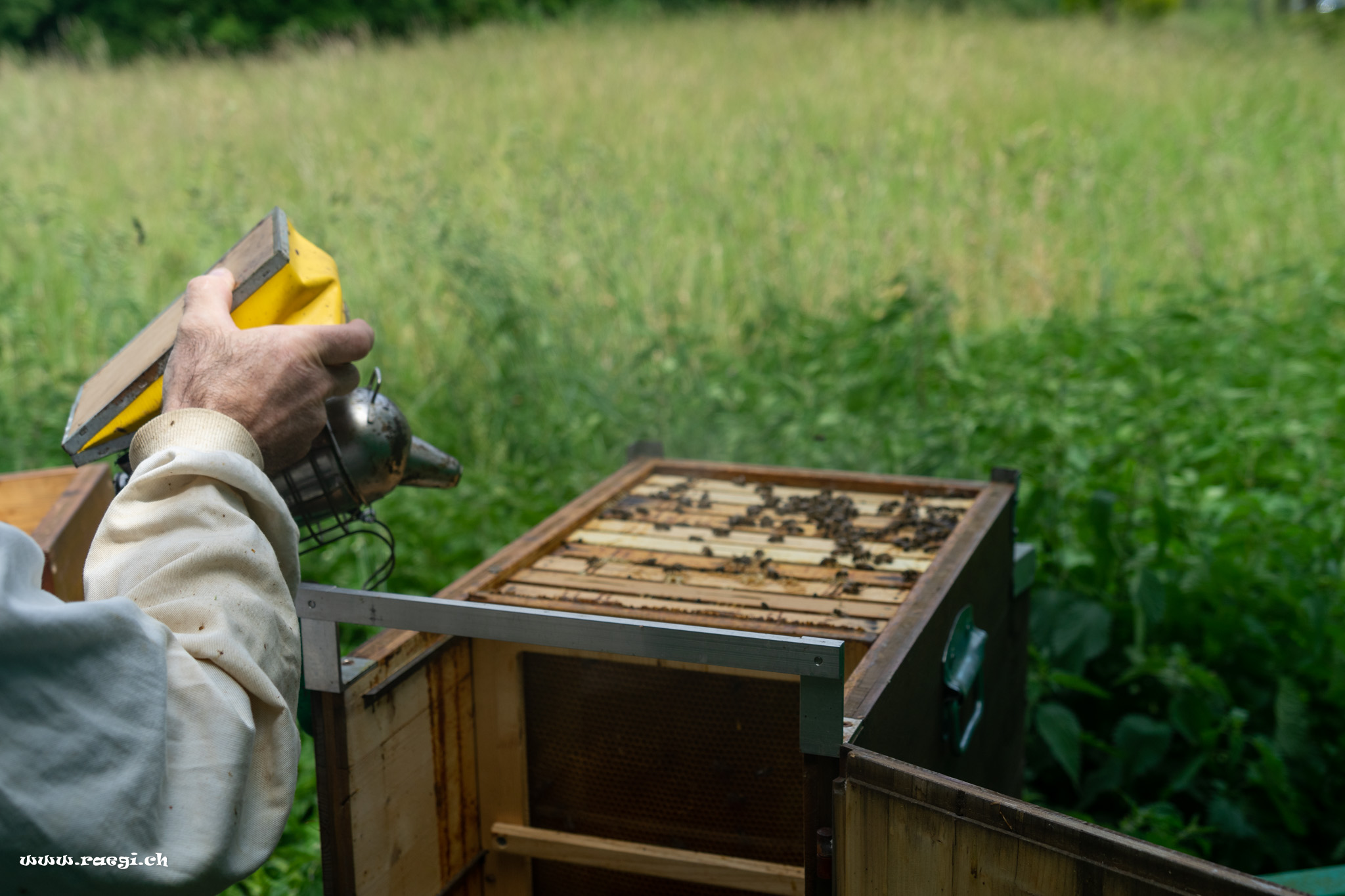 Arbeiten am Bienenhaus sollte man mit Rauch begleiten. Der Rauch setzt die Bienen in höchste Alarmbereitschaft. Sie treffen nun eifrig Vorkehrungen für eine schnelle Flucht aus dem Bienenhaus. Dazu füllen sie ihre Honigblasen mit Honig und sind dabei viel zu beschäftigt, den Imker bei seiner Arbeit wahrzunehmen oder zu stechen. Tämpi benutzt dazu einen speziellen Smoker. Er habe es auch schon mit „eme Chrumme“ versucht, aber es sei ihm dann vom Rauch selber schlecht geworden und der Rauch steigt in die Augen – dann bringts natürlich auch nicht viel. Ein entflohener Bienenschwarm wird mit einem Wasser-Spray benetzt und die Bienen halten das für Regen. Sie ziehen sich zusammen und fliegen nicht mehr aus. Die Behandlung mit Rauch nützt hier nichts, da die Bienen vor dem Ausschwärmen die Honigblase bereits gefüllt haben.