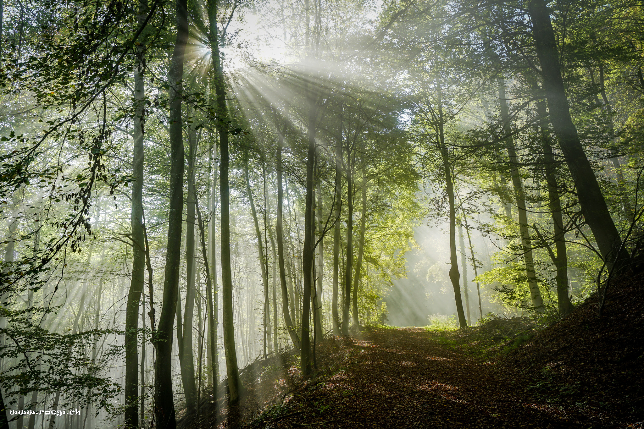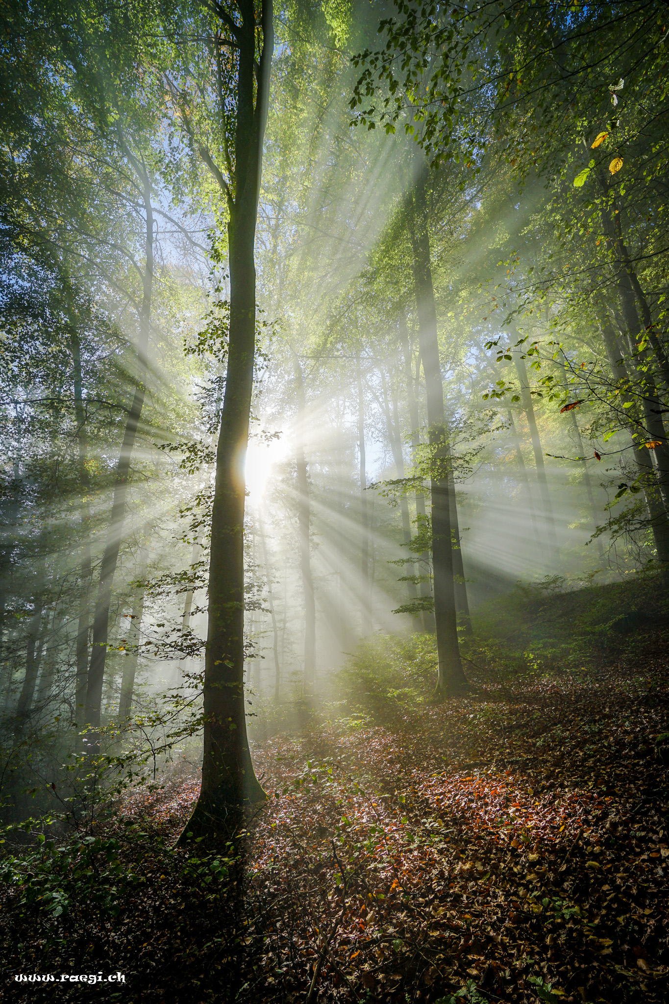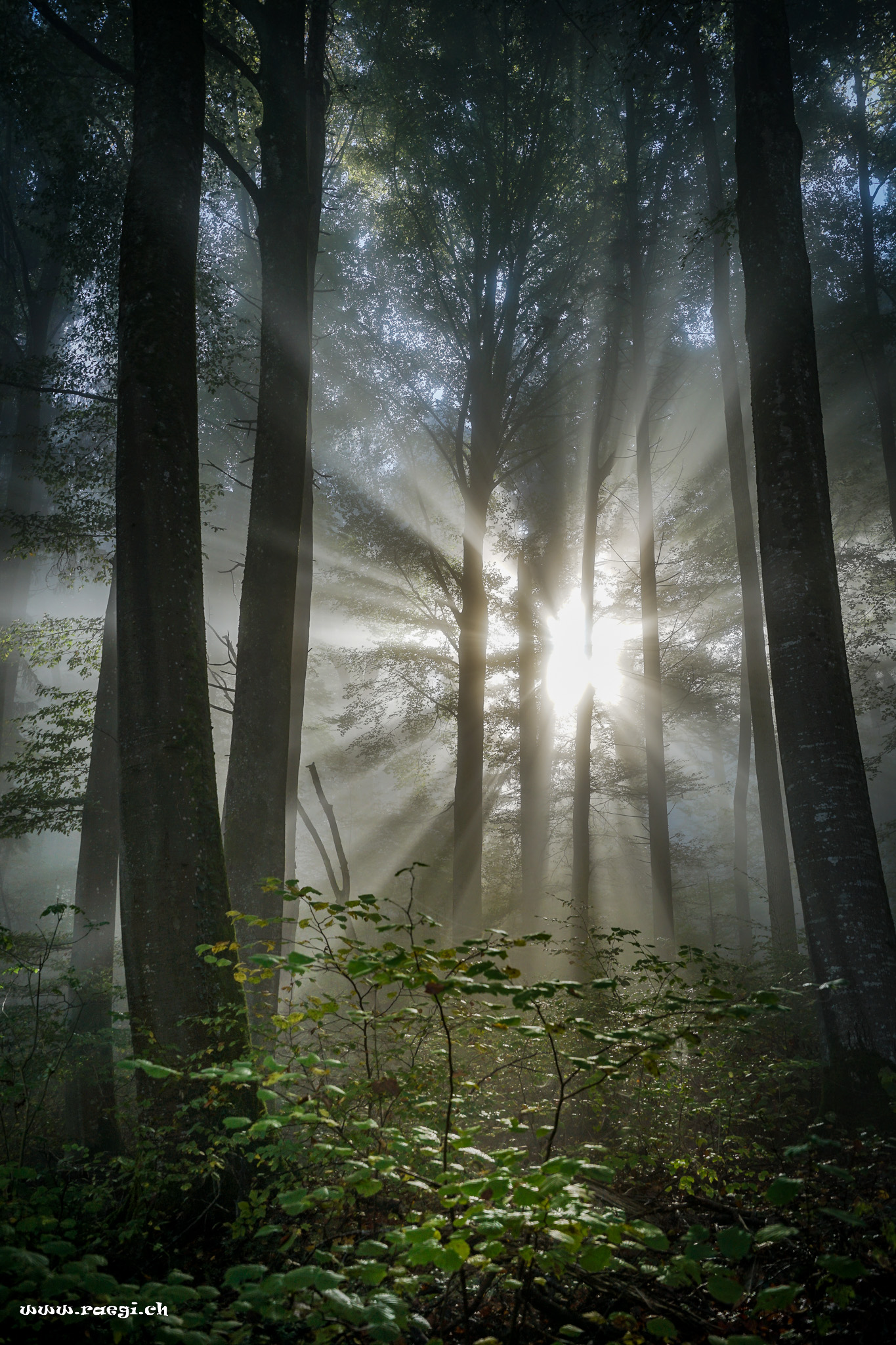 Erste Sonnenstrahlen durchdringen den Wald und Schatten und Licht vereinen sich zu einem Spiel aus Dunkel und Hell.