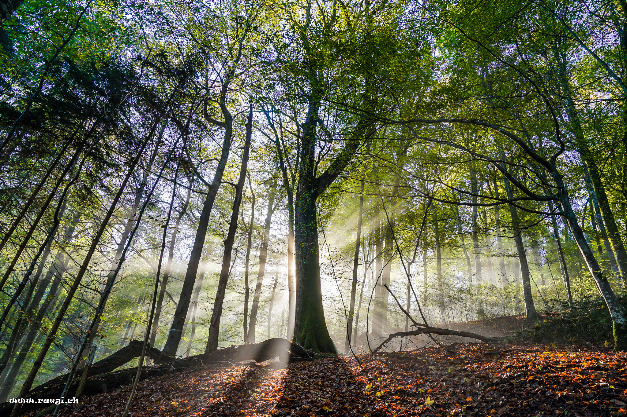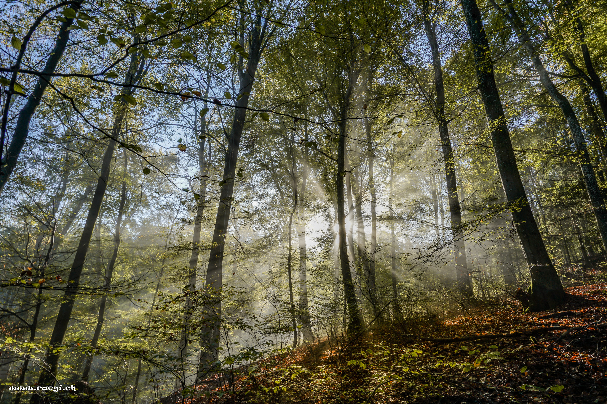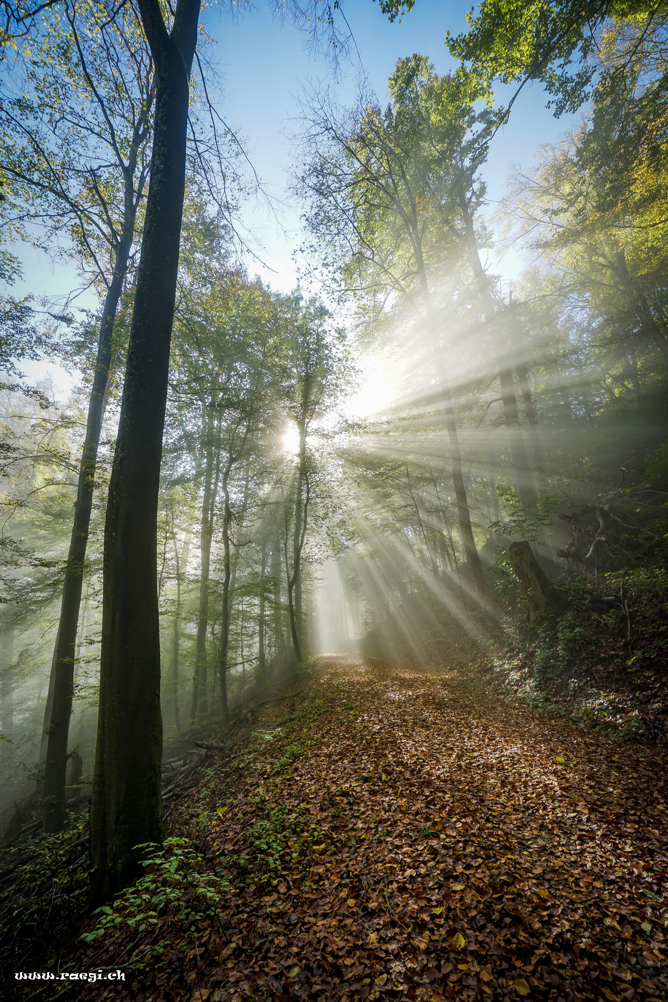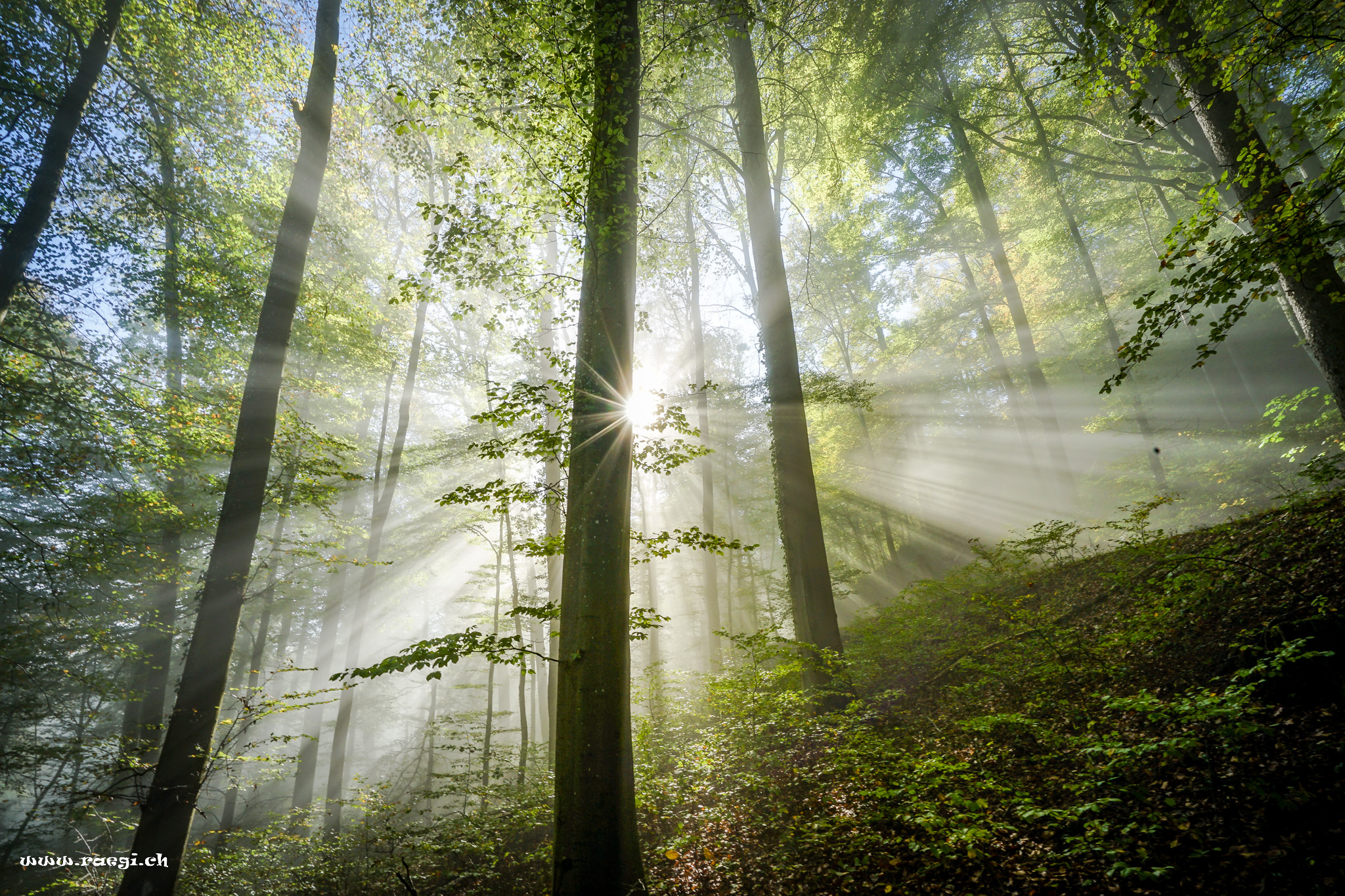 Erste Sonnenstrahlen durchdringen den Wald und Schatten und Licht vereinen sich zu einem Spiel aus Dunkel und Hell.