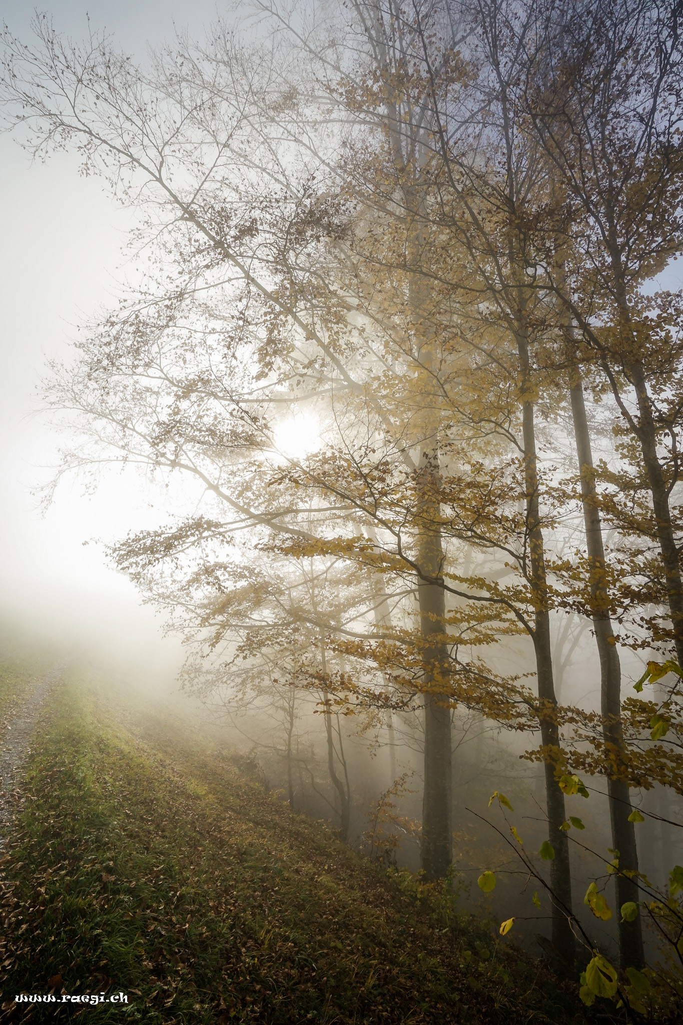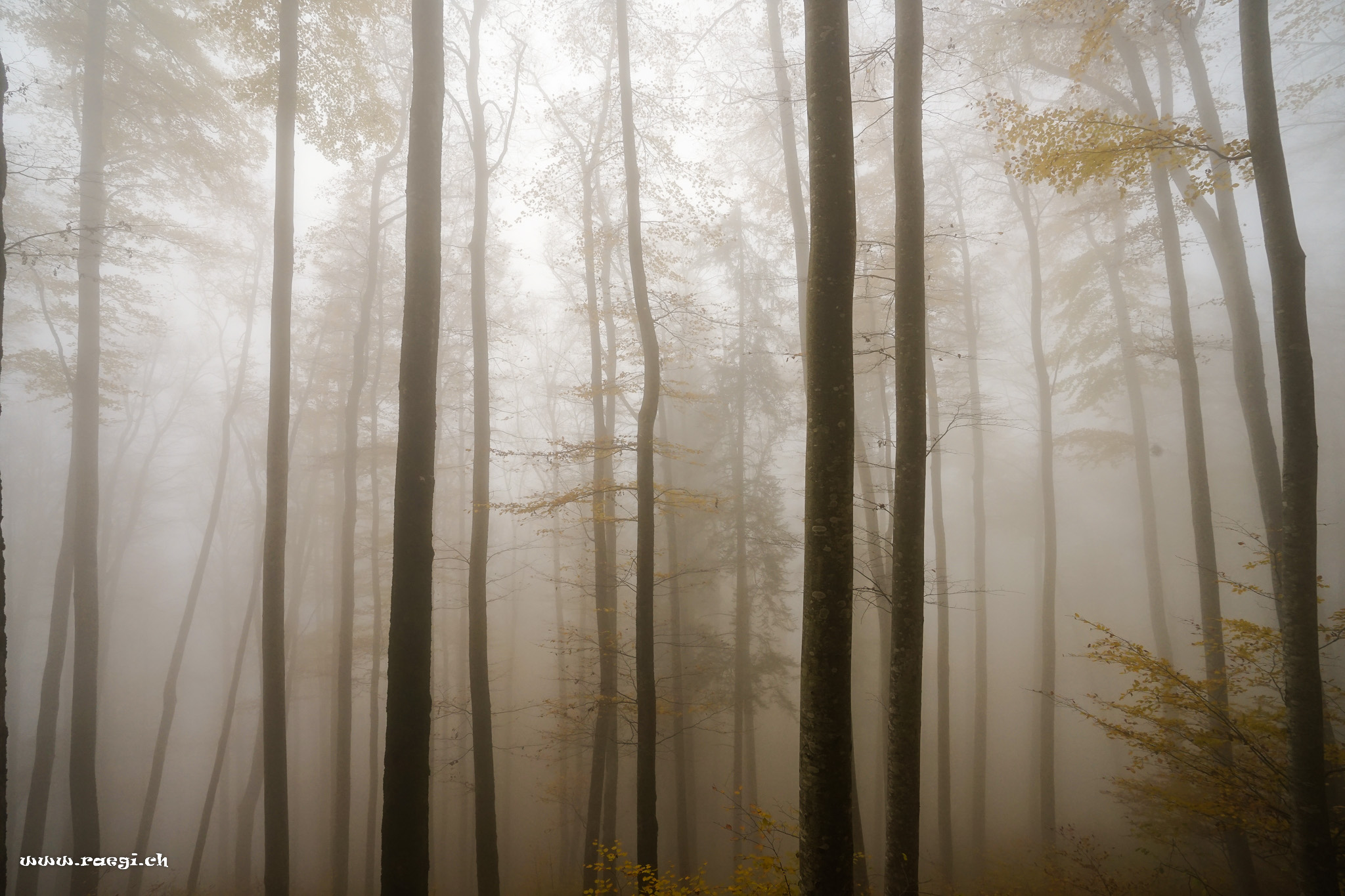 Der Nebel sammelt sich zwischen den Bäumen und klammert sich an den herbstlichen Waldboden.