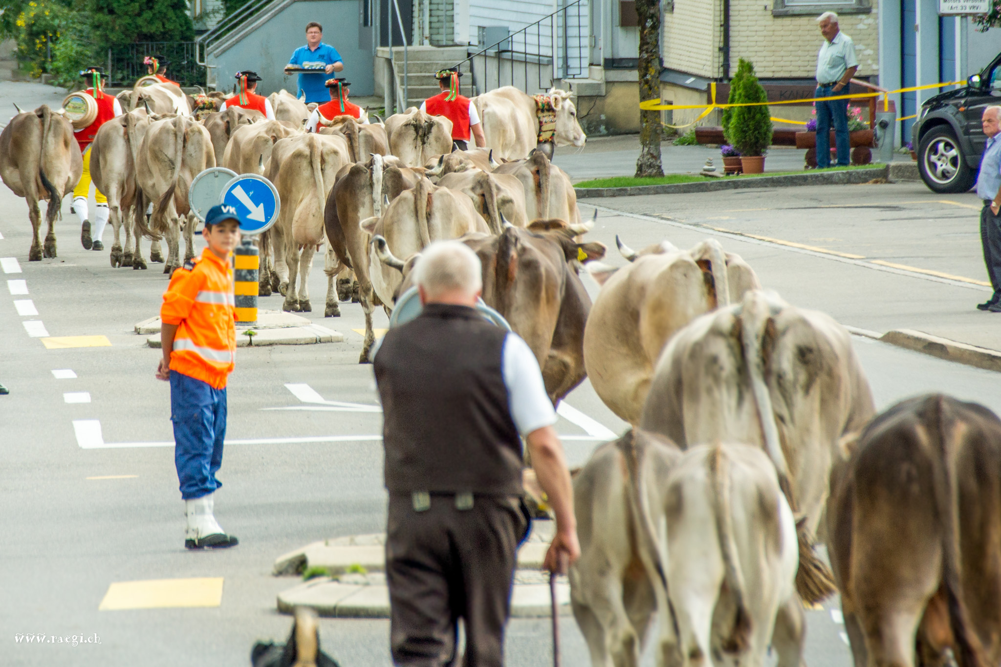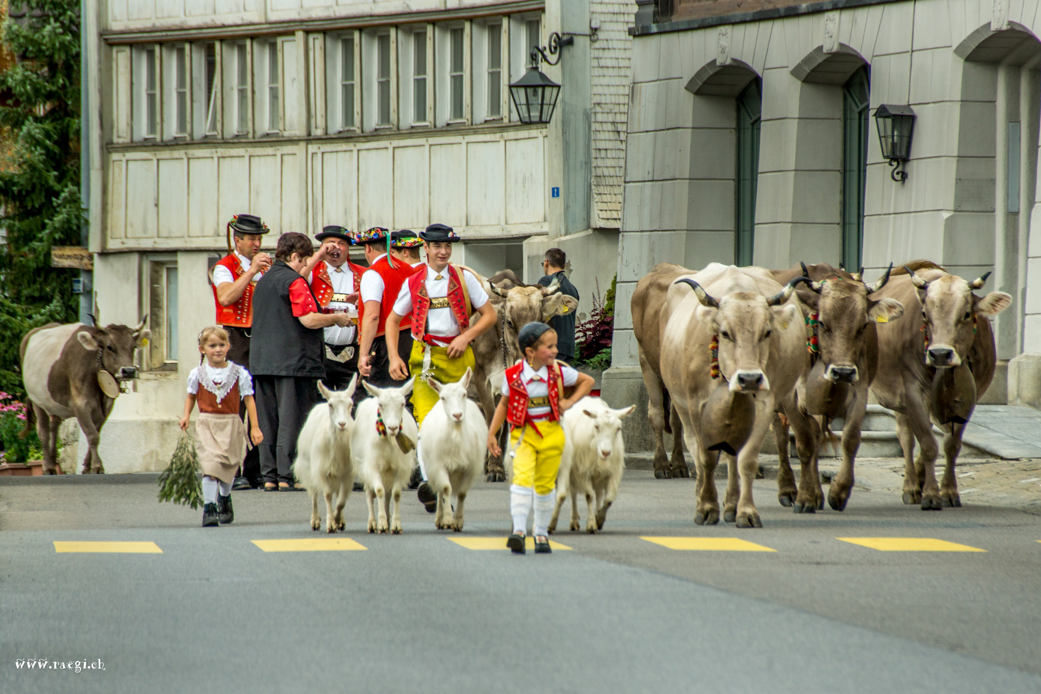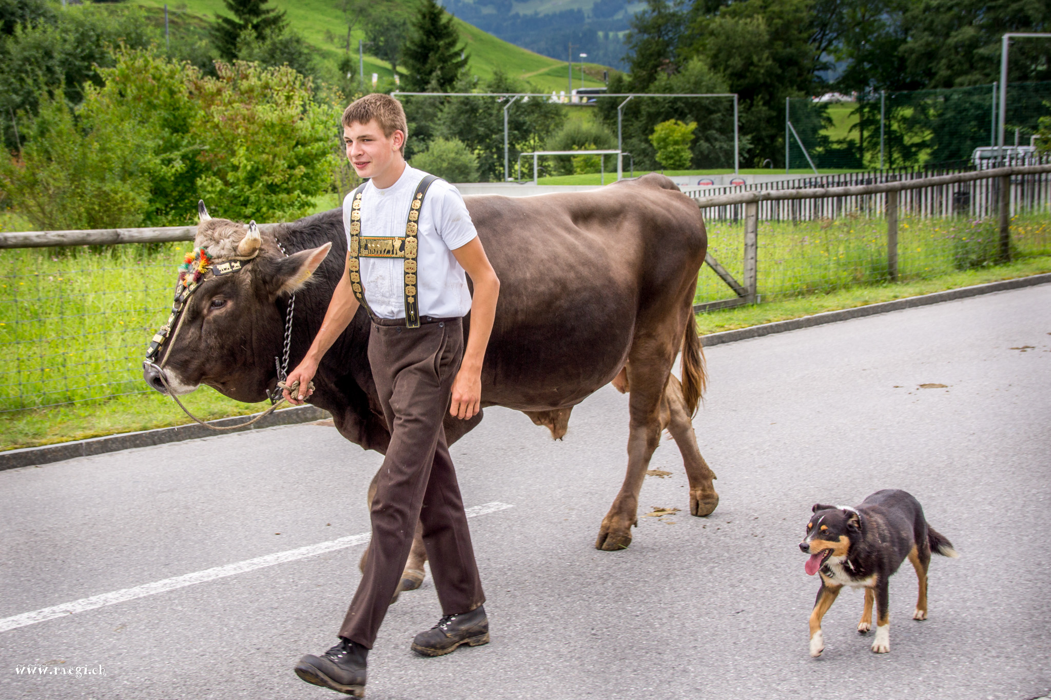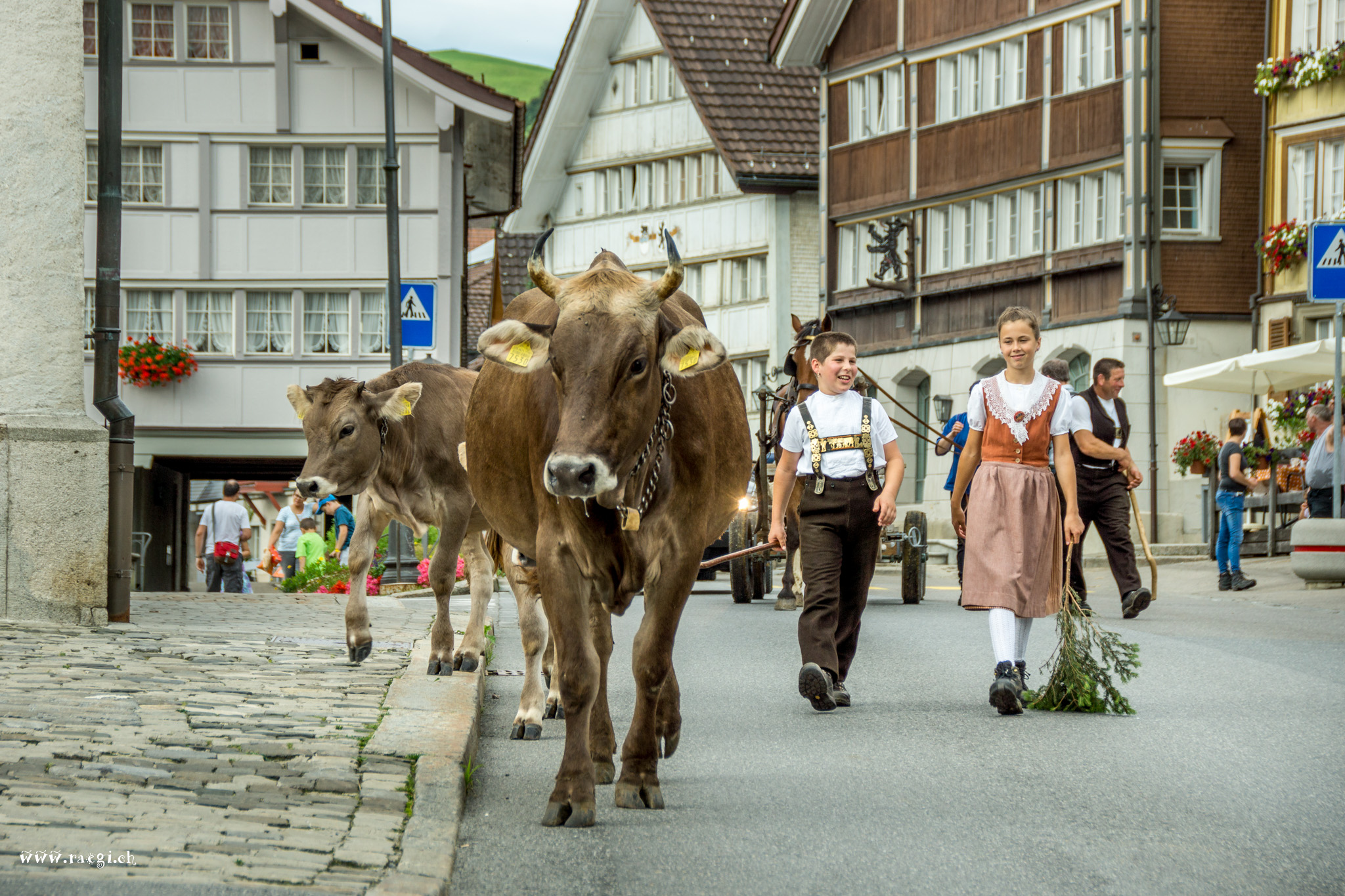 Bei der Alpabfahrt in Urnäsch darf auch ein Muni, bewacht vom Bläss mitlaufen