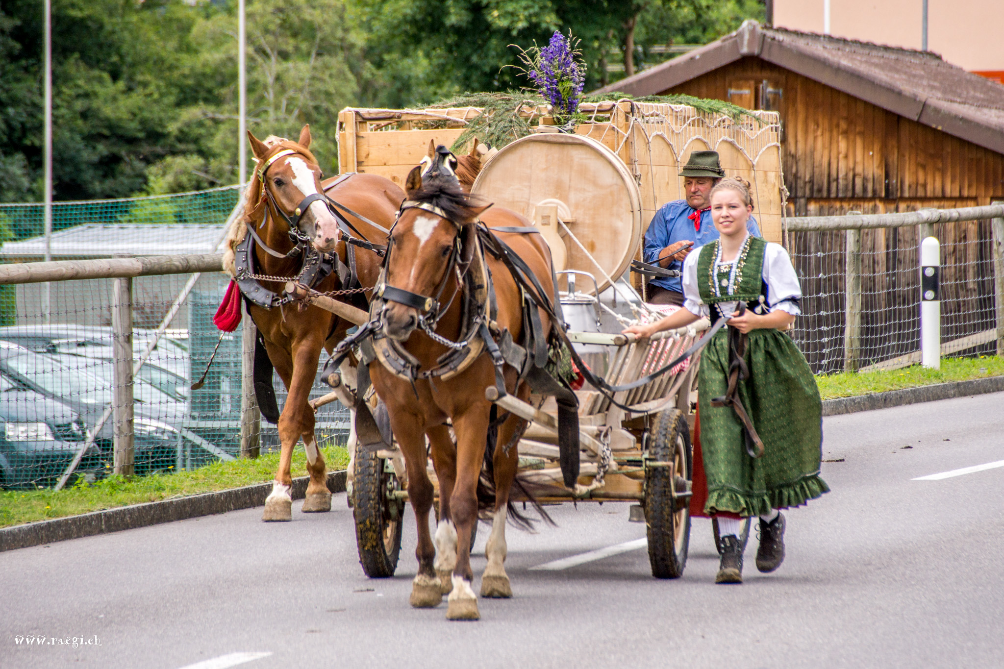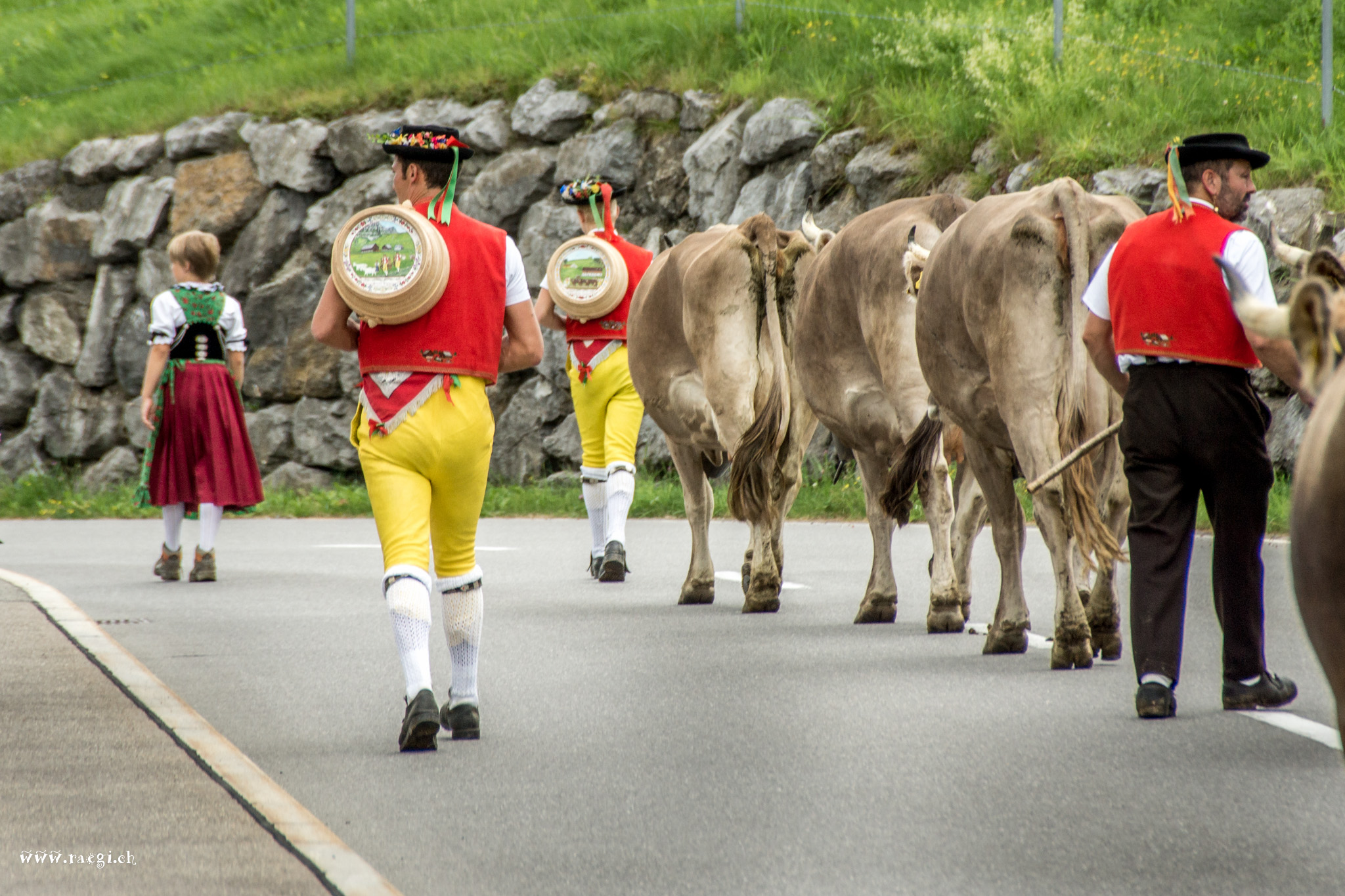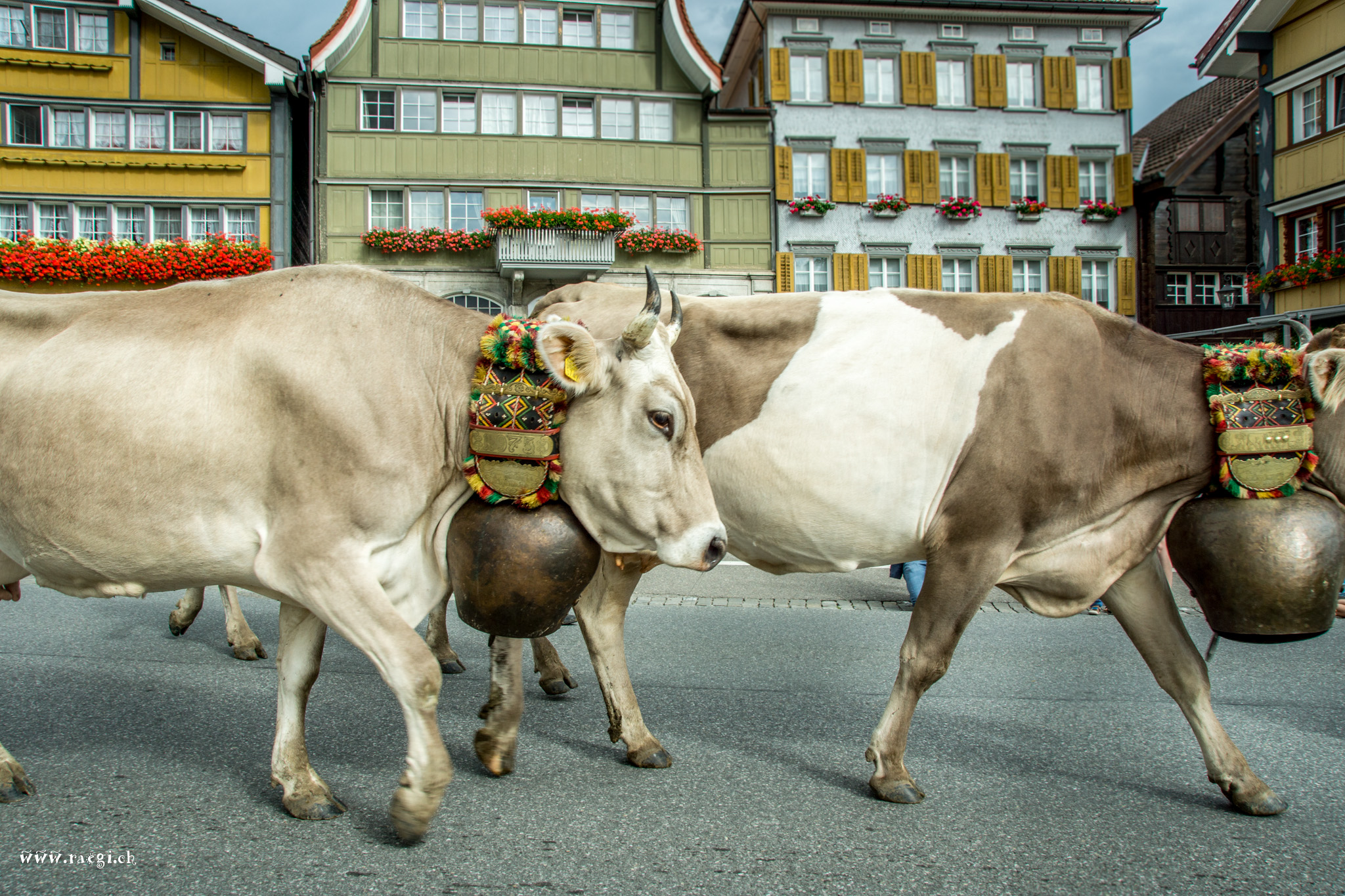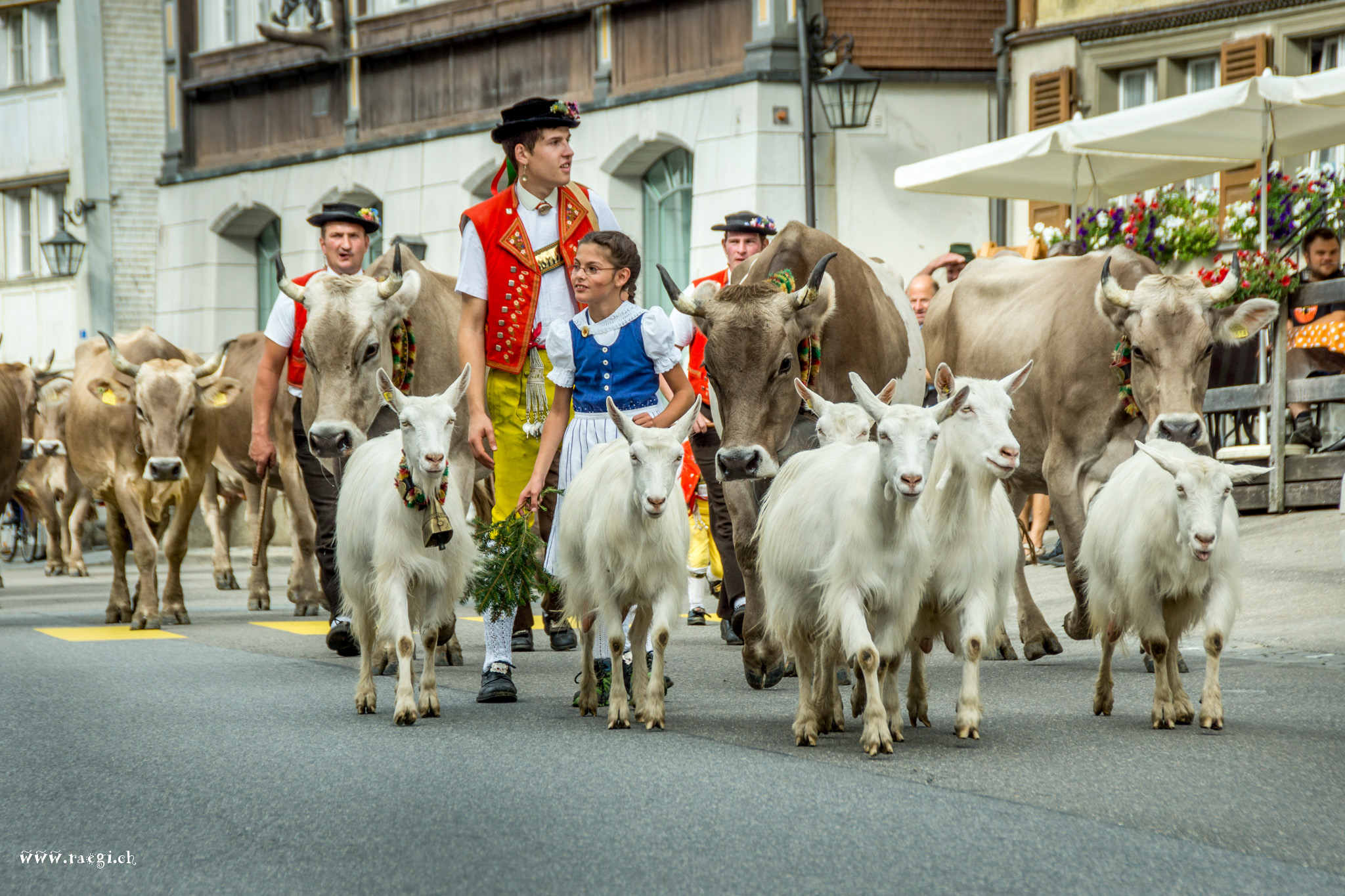 Bei der Alpabfahrt in Urnäsch darf auch ein Muni, bewacht vom Bläss mitlaufen