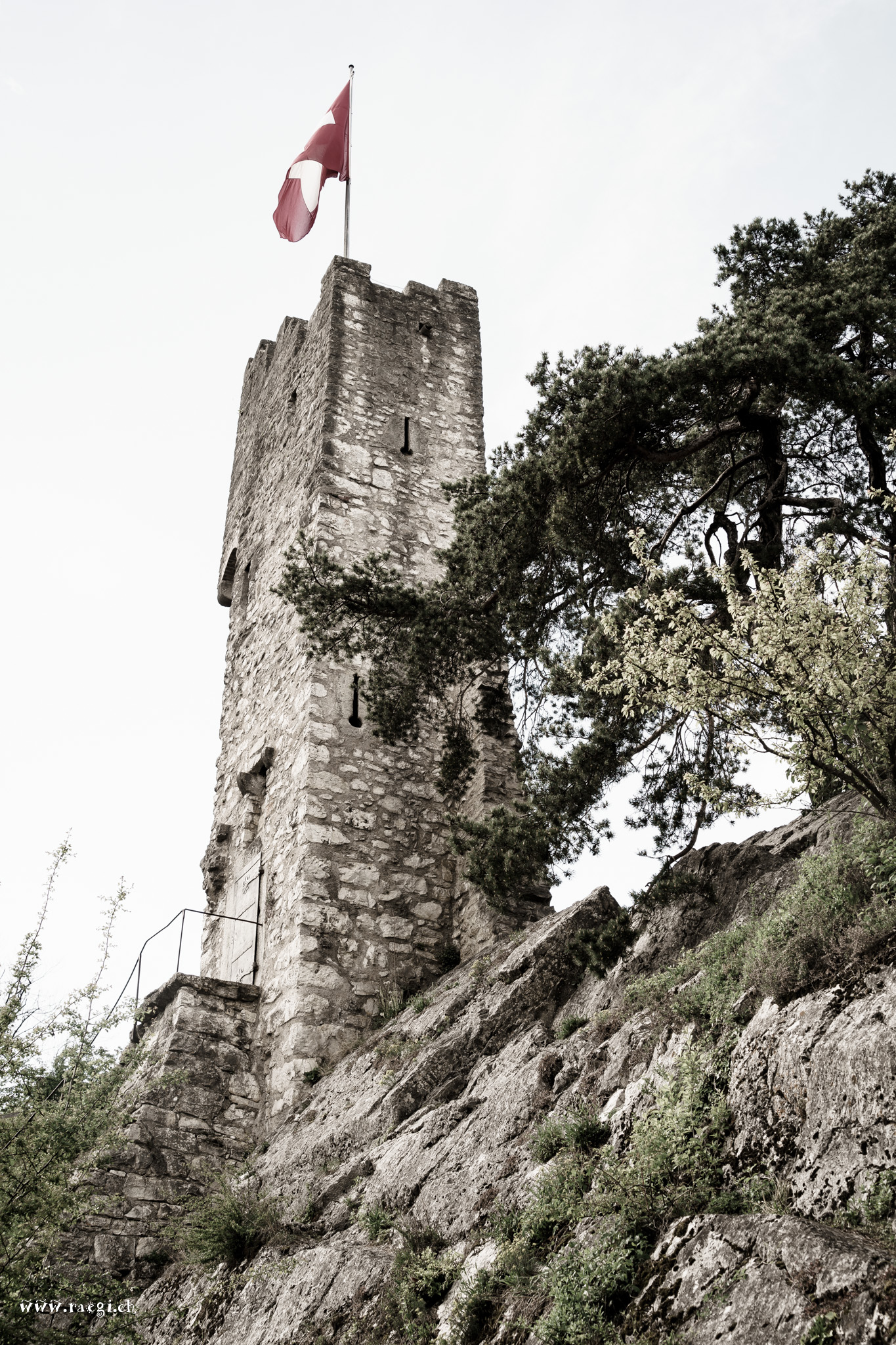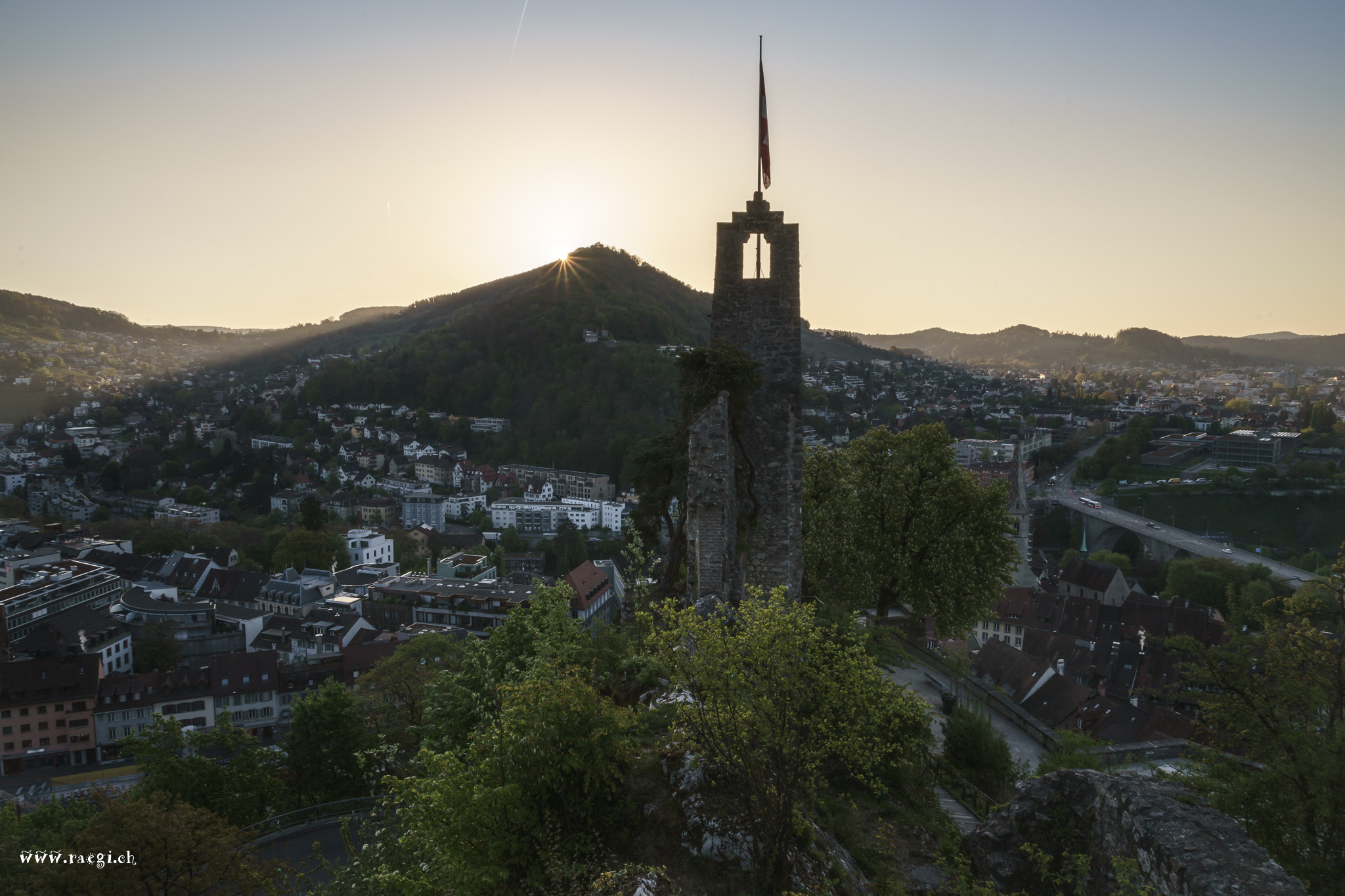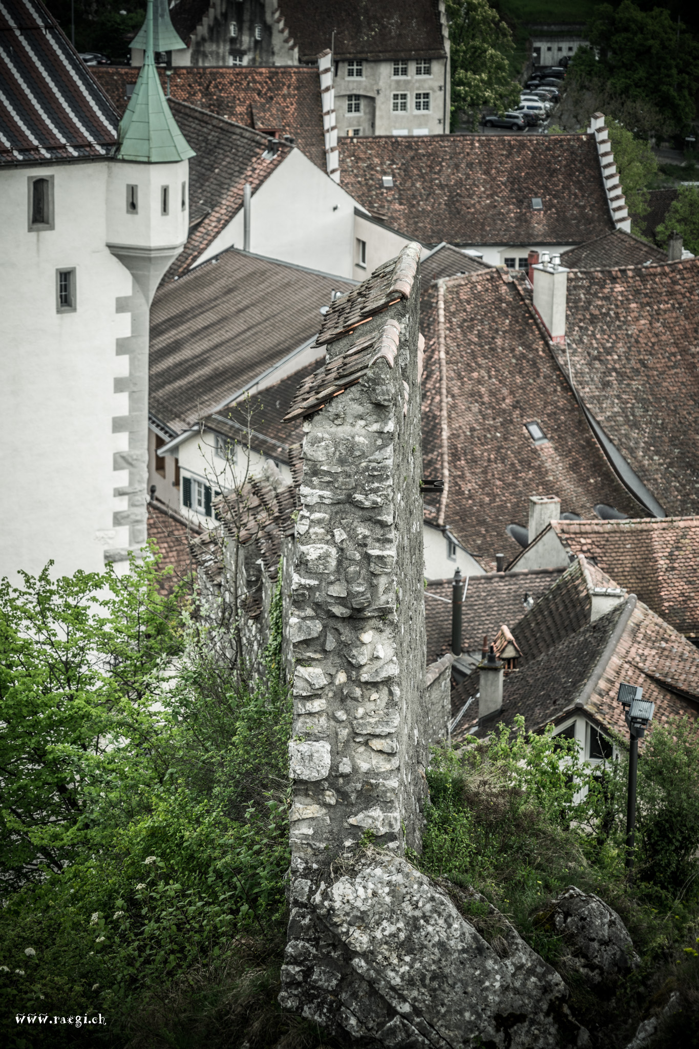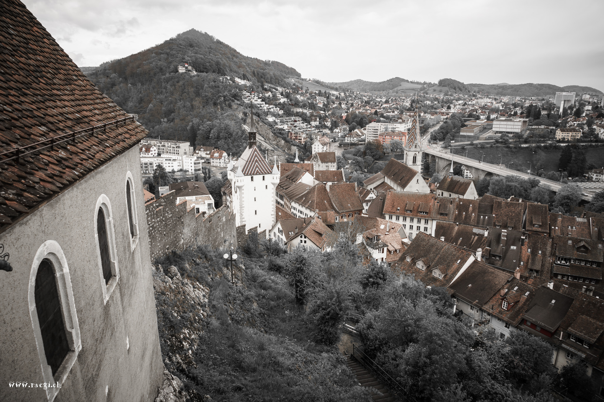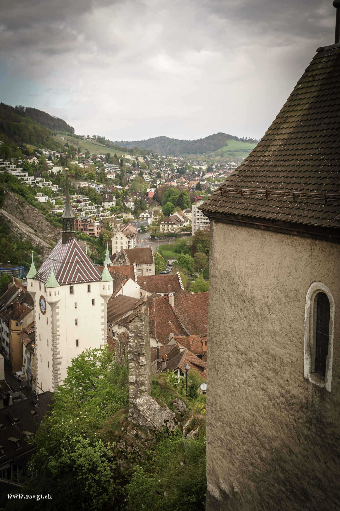 Hoch über der Stadt Baden sitze ich auf dem Schloss Stein. Mein Blick schweift von der Hochbrücke über die Altstadt zum Bahnhof und dahinter zur kleinen reformierten Kirche.