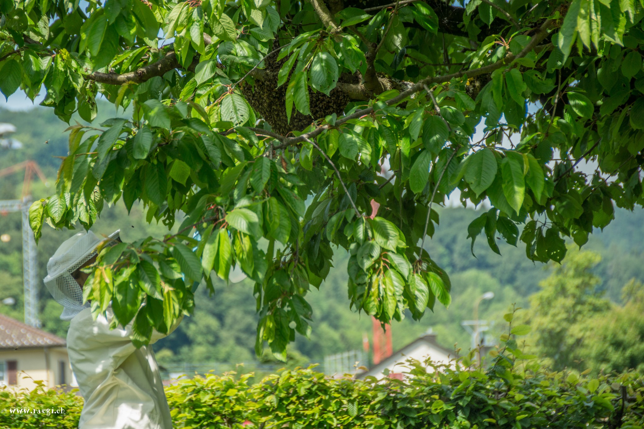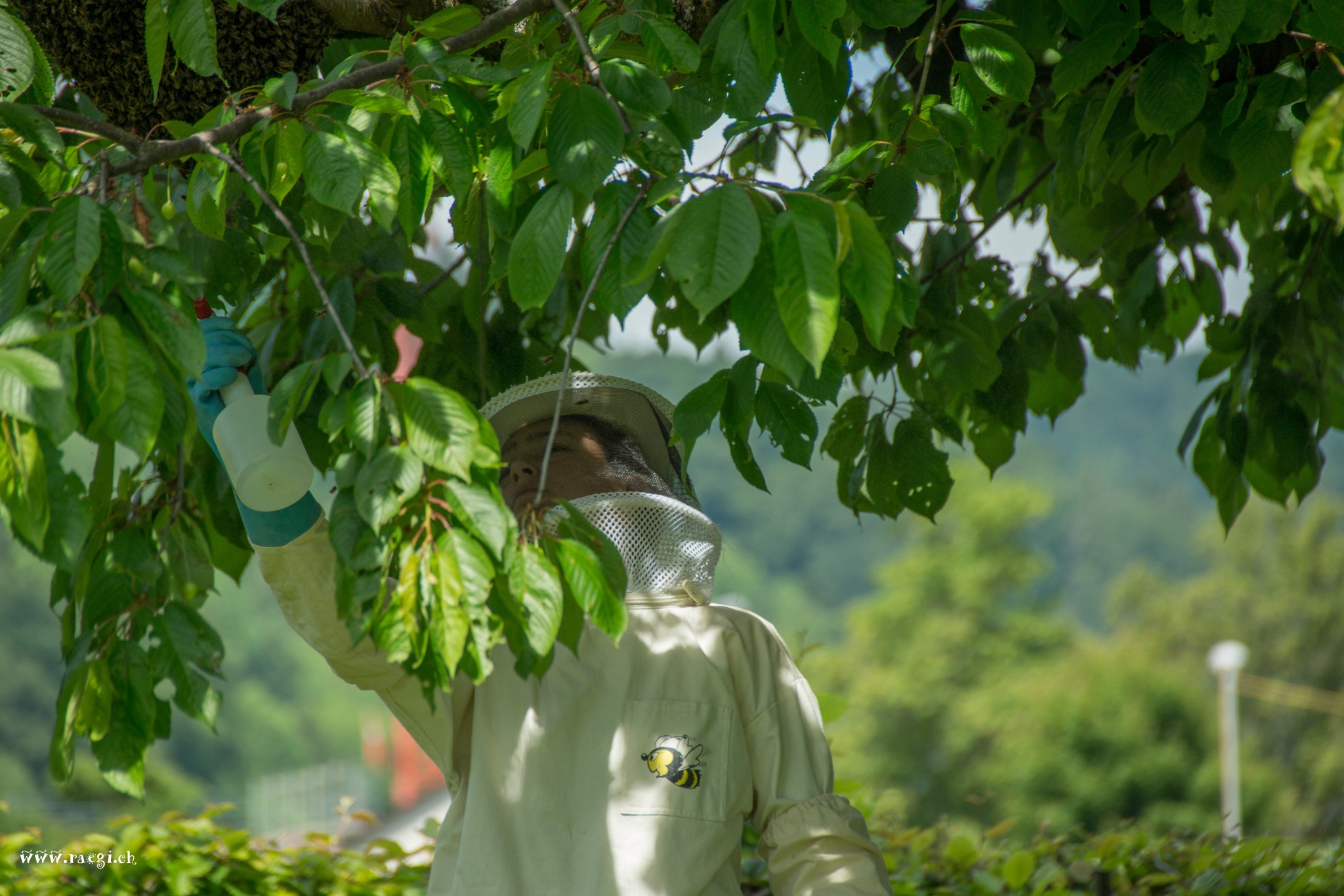 Um einen Schwarm einzufangen, besprüht der Imker den entflogenen Schwarm zuerst ein bisschen mit Wasser, damit sich die Bienen enger zusammenziehen.