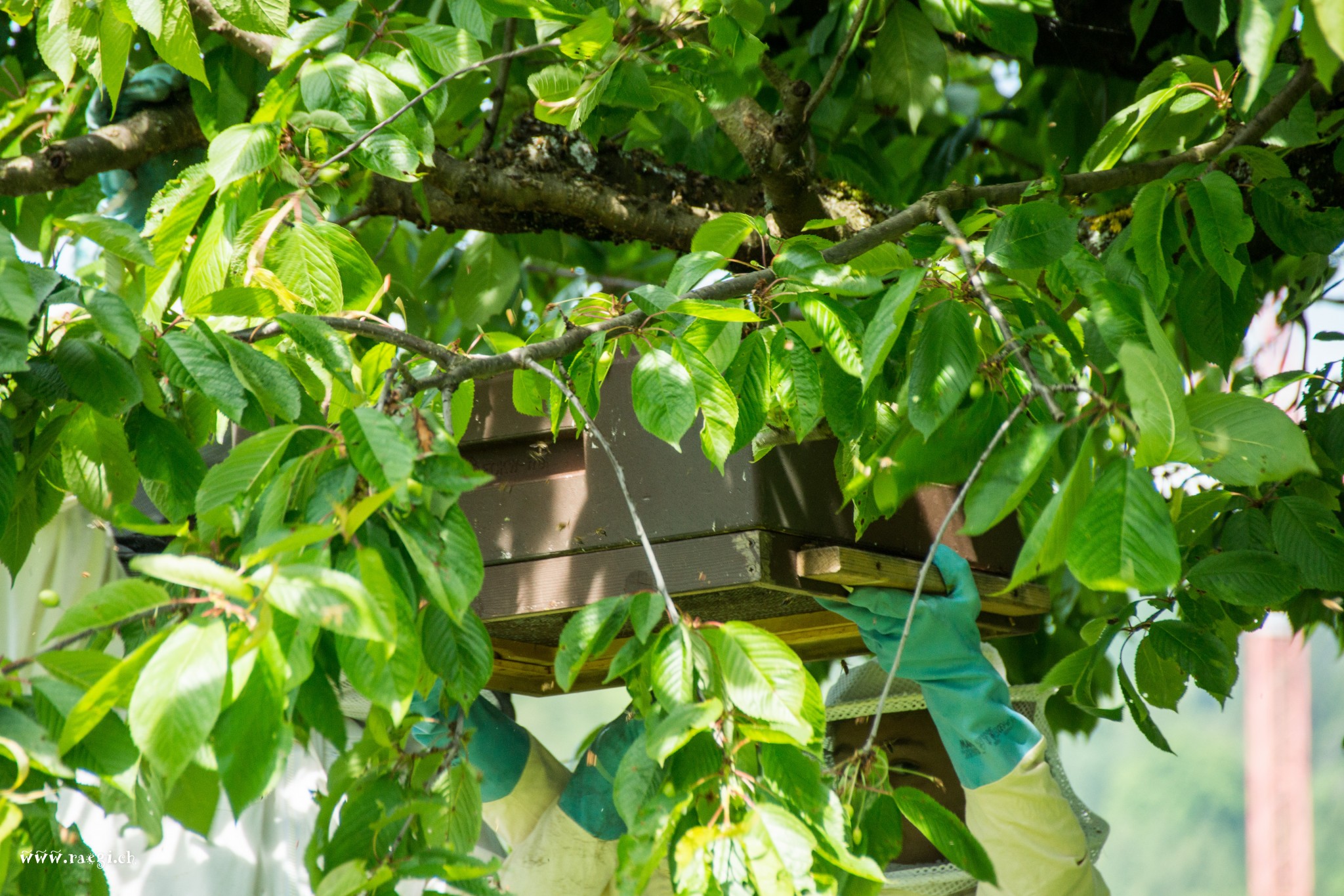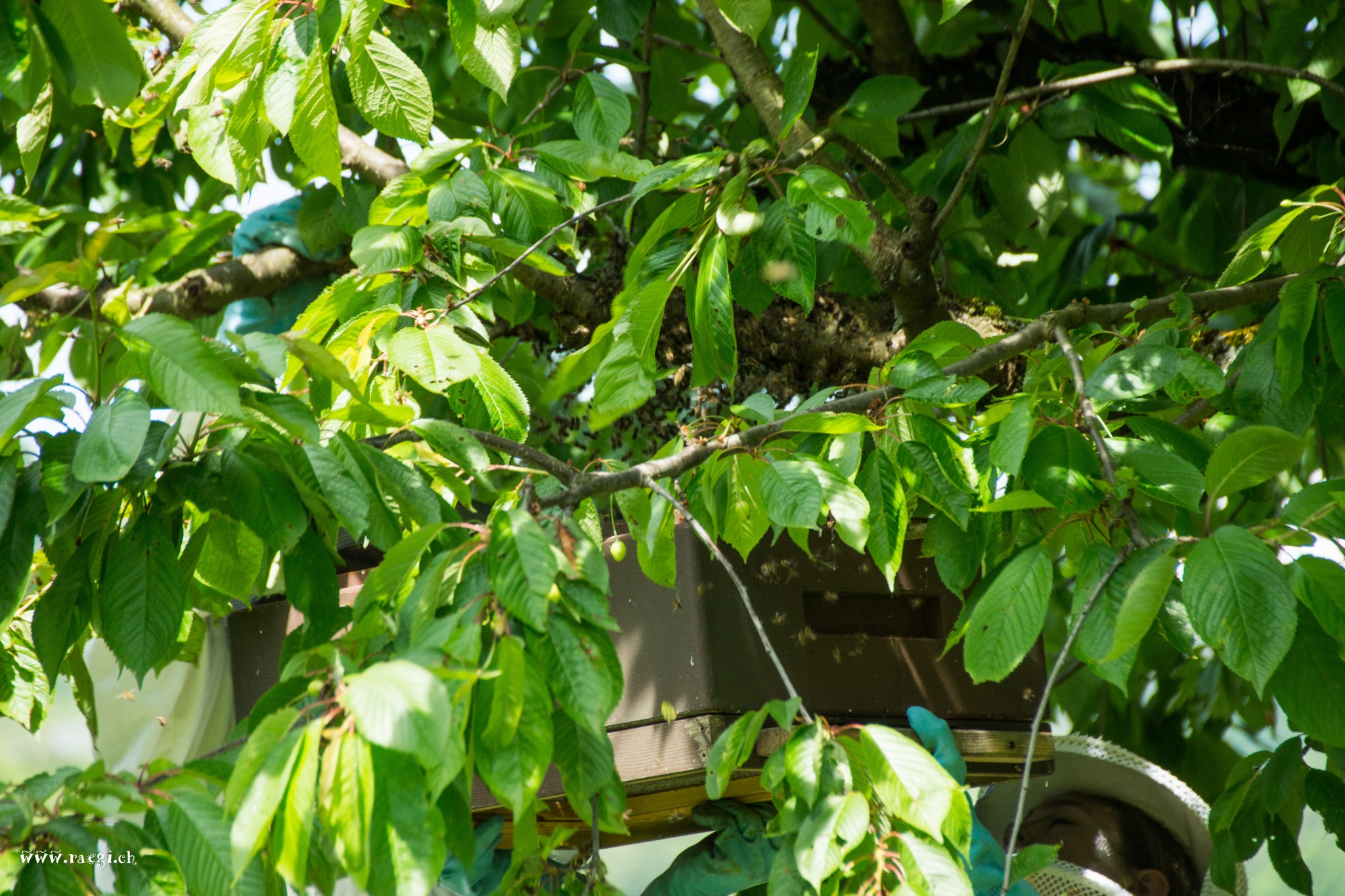 Dann die Schwarmkiste drunter halten und am Ast kräftig schütteln. Wichtig ist, dass die Königin in die Kiste fällt. Die Bienen ausserhalb der Kiste werden durch Duftsignale von den Anderen angelockt, so dass schlussendlich alle zur Königin finden.