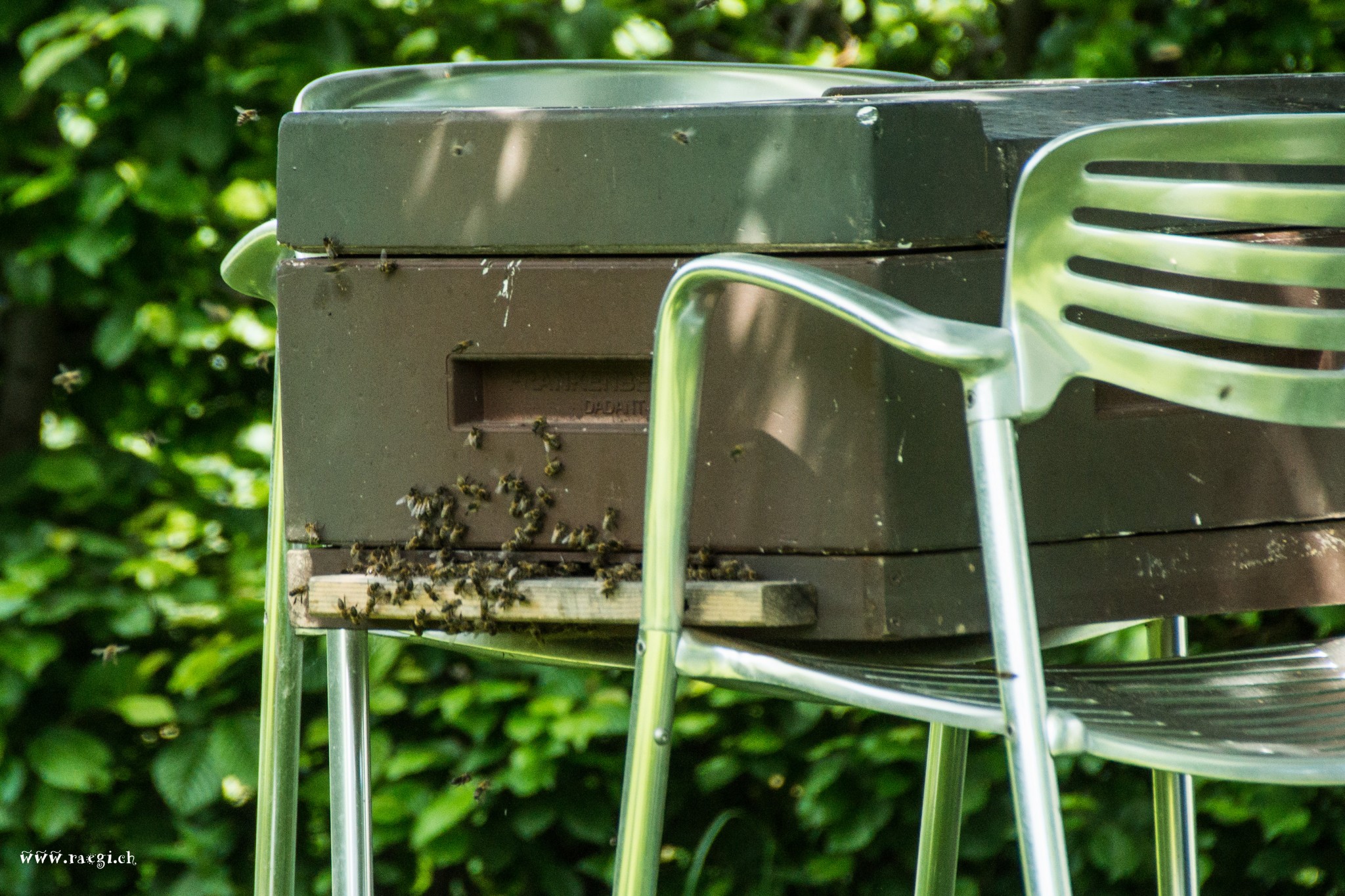 Die alte Königin hat sich in der Zwischenzeit auf ihren Abgang mit einem Fitness-Training und einer Diät vorbereitet. Im Normalfall Flugunfähig, kann sie jetzt wieder fliegen und nach dem 9 Tag macht sie sich zwischen 10:00 Uhr und 12:00 Uhr auf die Suche nach einer neuen Heimat. Dies aber nur wenn die Sonne scheint. Sonst wird die Aktion ein bisschen verschoben…