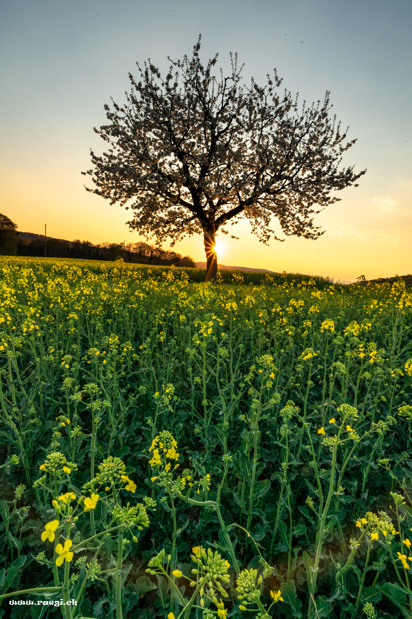 Rapsfeld mit Kirschbaum im warmen Abendlicht
