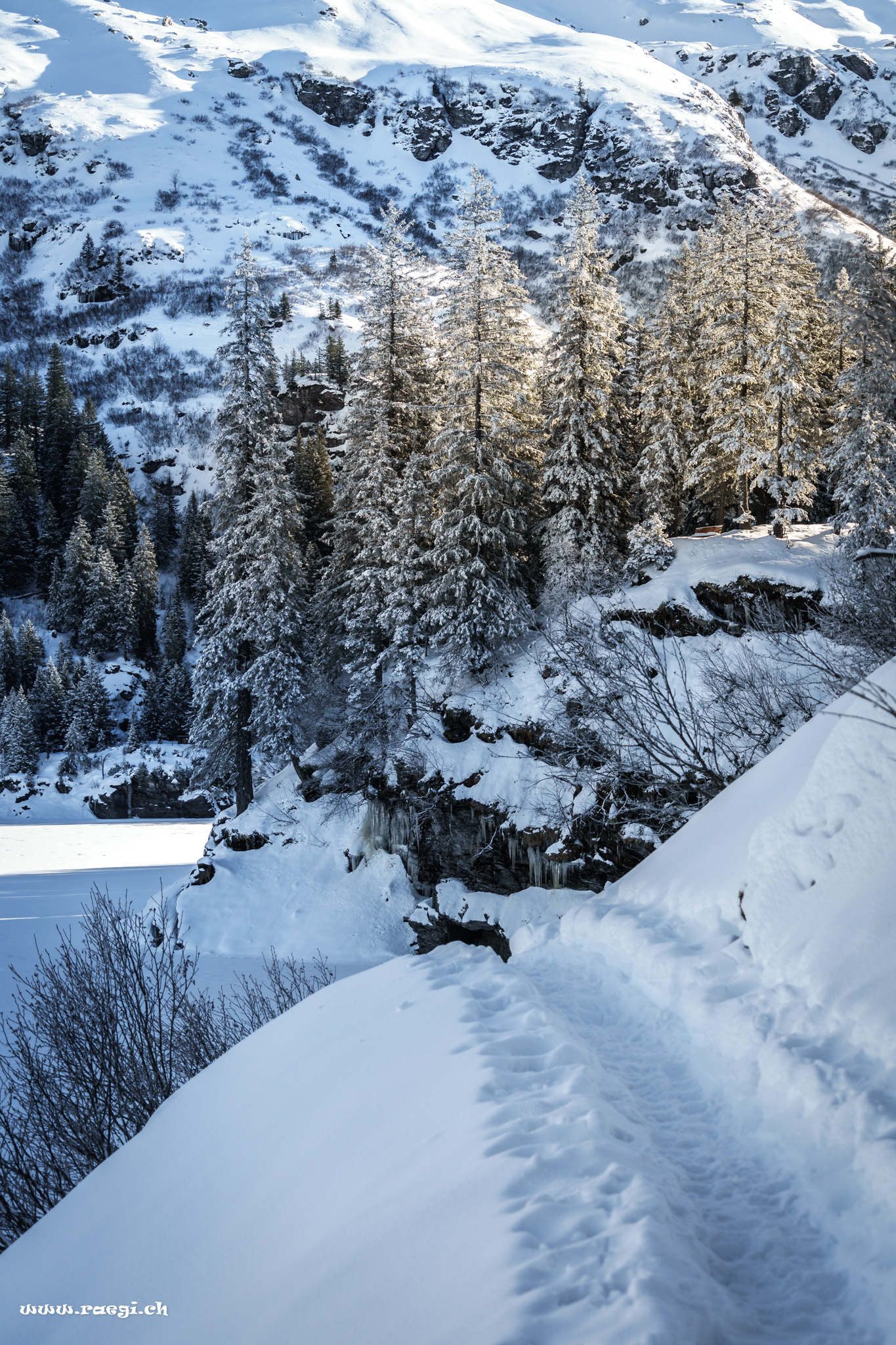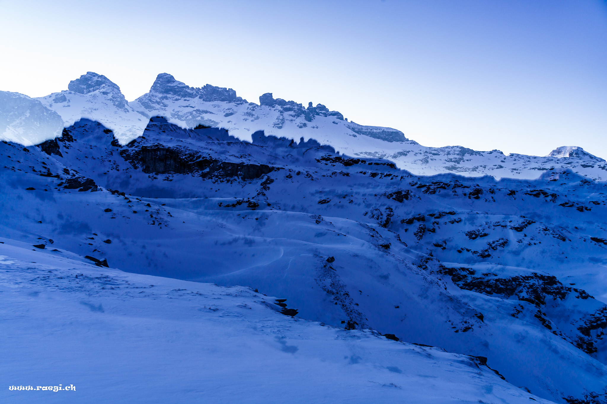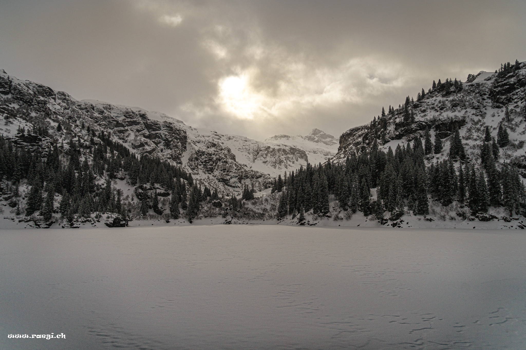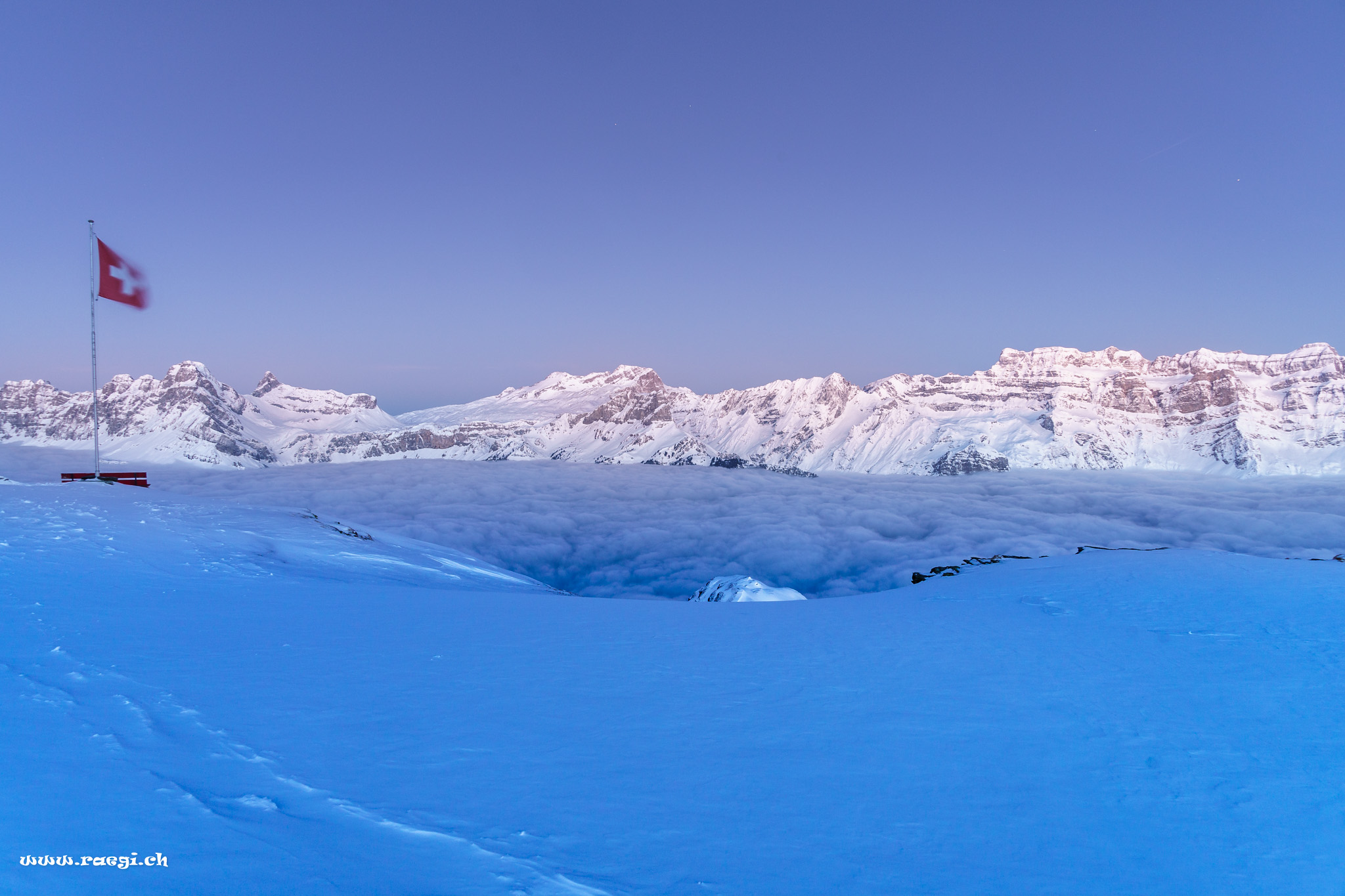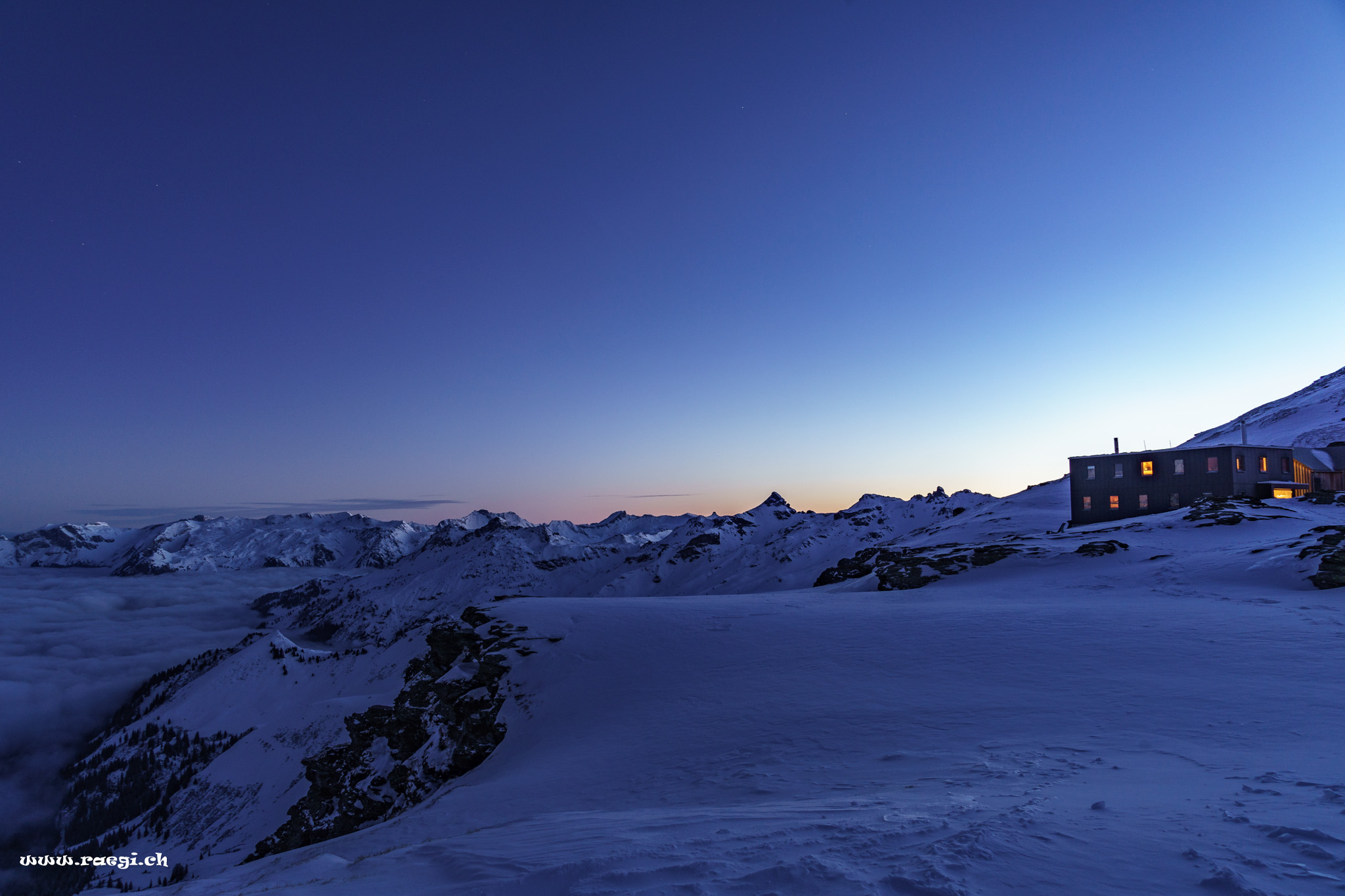 Mitten im Glarnerland, findet man eine traumhafte Schneeschuhtour zur Leglerhütte. Die Tour geht durch das Gebiet „Freiberg Kärpf“ ca. 700m s Loch uf.. Gestartet sind wir gut ausgerüstet mit LSV (Lavinenverschüttetensuchgerät), Schneeschaufel, Schlafsack, Essen und Fotoausrüstung inkl. Stativ beim Garichtisee auf der Mettmenalp. Hier gäbe es noch ein wunderschönes Hotel mit tollem Ausblick auf das Glarnerland. Dies lassen wir aber gleich links stehen und begeben uns auf den Aufstieg durch die verschneite Landschaft. Ein kurzer Picknick-Halt bei einer Alp und weiter gehts immer den gut sichtbaren Markierungen nach.